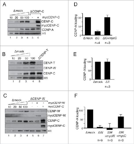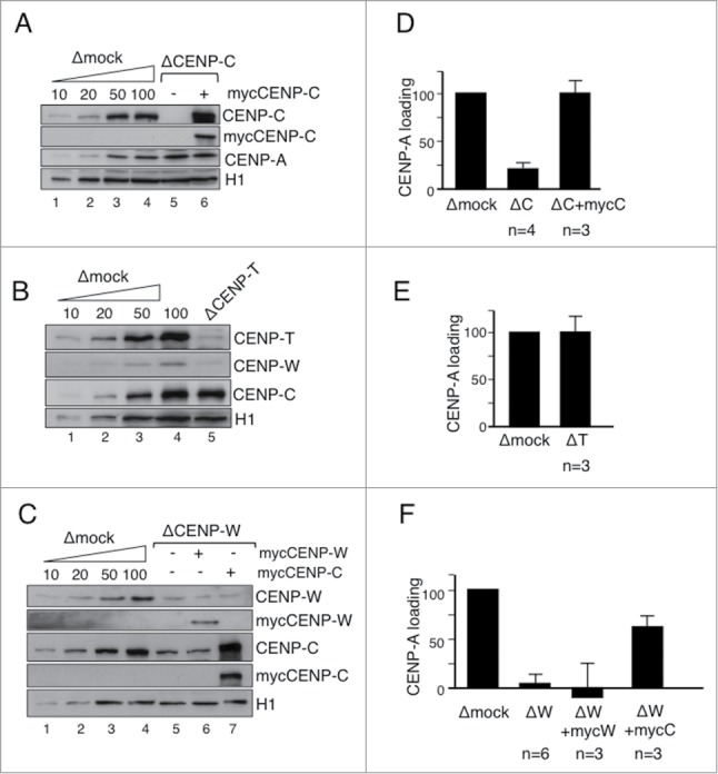 Figure 4. CENP-T and CENP-W are not required for CENP-A loading. (A-C) Immunoblot analyses of extracts used in the CENP-A loading assays shown in (D-F). Increasing amounts of mock depleted CSF extract (Δmock) and extracts depleted from the indicated proteins with or without add-back of myc-tagged proteins were analyzed side by side. H1 is used as a loading control. In (C), the CENP-W(2) antibody was used for depletion. (D-F) Bar graphs representing CENP-A loading efficiency in nuclei assembled in the indicated extracts. More than 250 centromeres were quantitated per condition and experiment. The number of experiments (n) is indicated below each bar. Bars represent mean± SEM.