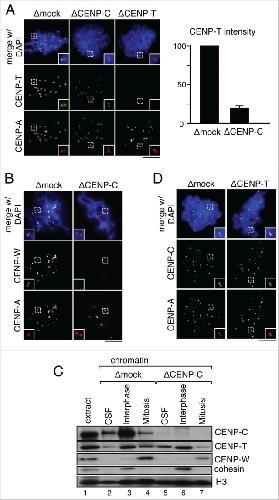 Figure 5. Maintenance of CENP-T/W at mitotic centromeres depends on CENP-C. (A) Immunofluorescence analysis of CENP-T (green) localization at mitotic centromeres (labeled by CENP-A, red) assembled in extracts that had been mock-depleted or depleted of CENP-C. The graph on the right shows the centromeric fluorescent intensity for CENP-T as percentage of the mean value obtained in the corresponding control experiment. At least 970 centromeres were measured for each condition in 5 independent experiments. (B) CENP-W localization in chromosomes assembled as in (A). (C) Immunoblot analysis of chromatin fractions assembled in CSF, interphase and mitotic extracts following depletion of CENP-C or mock depletion as control. Cohesin (Rad21) is a marker for interphase. Histone H3 is used as loading control. (D) Immunofluorescence analysis of CENP-C (green) localization at mitotic centromeres (labeled by CENP-A, red) in chromosomes from mock depleted or CENP-T depleted extracts. Scale bars, 10 μm.