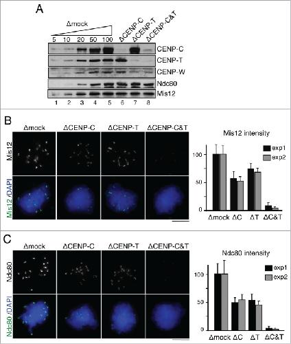 Figure 6. CENP-C and CENP-T/W contribute to kinetochore assembly. (A) Immunoblot analysis of the extracts used to assemble the chromosomes shown in (B) and (C). (B-C) Representative examples of chromosomes assembled in mock depleted extracts and extracts lacking CENP-C, CENP-T or both, and stained with antibodies against Mis12 (B) and Ndc80 (C). Quantification of total fluorescence in dots per chromosome mass is shown in the graphs on the right. Bars represent mean± SD. Between 10 and 20 nuclei per condition were measured in 2 independent experiments (exp1 and exp2).