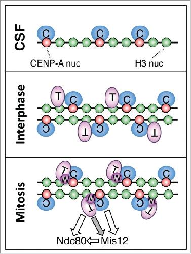 Figure 7. Sequential recruitment of CENP-C, CENP-T and CENP-W to centromeres in Xenopus egg extracts. CENP-C recognizes CENP-A and binds to centromeric chromatin when sperm is added to CSF extracts. When these extracts are driven to interphase, de novo loading of CENP-A occurs, which requires CENP-C but no CENP-T or CENP-W. The new CENP-A also recruits more CENP-C. Soon after DNA replication, CENP-T binds to centromeres. CENP-C is not strictly required for this process, but its presence may stabilize the incorporated CENP-T. Upon entry in mitosis, CENP-W can be detected at centromeres. CENP-C becomes more important for maintenance of CENP-T/W at this stage, most likely by providing stability to centromeric chromatin. Both CENP-C and CENP-T/W direct kinetochore assembly by recruiting Mis12C and Ndc80C, respectively. It is currently unclear how CENP-T affects Mis12C recruitment independently of Ndc80C (gray arrow), although a weak interaction between them has been detected in vitro.24