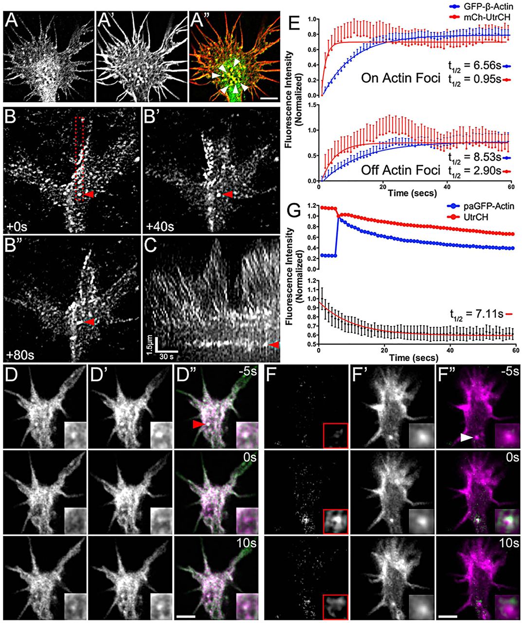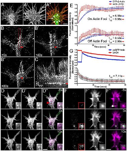Fig. 3. F-actin foci are sites of actin polymerization. (A-Aâ²) Confocal microscopy images of a growth cone on laminin stained for G-actin (A) and F-actin (Aâ²). Note the colocalization of monomeric actin with F-actin foci in the merged image (Aâ², arrowheads). (B-Bâ²) Time-lapse TIRF images of a live growth cone cultured on laminin and labeled with TMR-KabC. Note that stable barbed ends (arrowhead). (C) Kymograph from the boxed region in B illustrating the rearward flow of KabC-capped actin filaments (angled lines) in the P-domain and stable actin foci in the C-domain (arrowhead). (D-Dâ²) Confocal microscopy images of a live growth cone expressing GFP-β-actin (D) together with mCh-UtrCH (Dâ²) and an image merge (Dâ²) during photobleaching of GFP-β-actin. Note photobleaching (0â s) and recovery (10â s) of GFP-β-actin at an mCh-UtrCH-labeled foci (arrowhead). (E) Normalized fluorescence recovery rate after photobleaching of GFP-β-actin within regions over foci (on foci, upper graph) and in regions adjacent to foci (off foci, lower graph). More rapid recovery of mCh-UtrCH is likely to be the result of a more rapid exchange rate of F-actin binding protein (nâ¥59). (F-Fâ²) Confocal microscopy images of a live growth cone expressing PA-GFP-γ-actin (F) together with mCh-UtrCH (Fâ²) and an image merge (Fâ²) during photoactivation of PA-GFP-γ-actin. Note rapid photoactivation (0â s) and decay of PA-GFP-γ-actin at an mCh-UtrCH-labeled F-actin foci (arrowhead). (G) Normalized fluorescence decay rate after photoactivation of PA-GFP-γ-actin at foci together with slow bleaching of mCh-UtrCH signal (upper graph). The ratio of PA-GFP-γ-actin fluorescence versus that of mCh-UtrCH bleaching provides a measure of γ-actin turnover (lower graph) (nâ¥59). Scale bars: 5â µm (A,B,D,F); 2.5â μm (insets in D,F). |