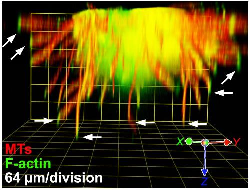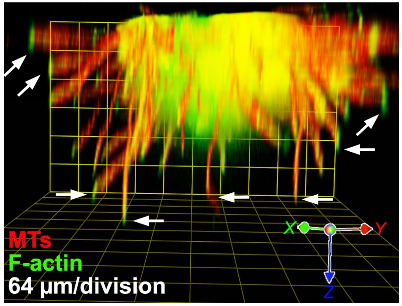 Fig. S5. Xenopus spinal axons extend deep into a 3D collagen gel. Confocal Z-series 3D reconstruction of a Xenopus spinal explant cultured on top of a collagen-1 gel. The explant was fixed and stained for Factin with phalloidin (green) and immuolabeled for MTs (red). The deepest axons tipped by growth cones (arrows) extend greater than 300 μm into the gel. |