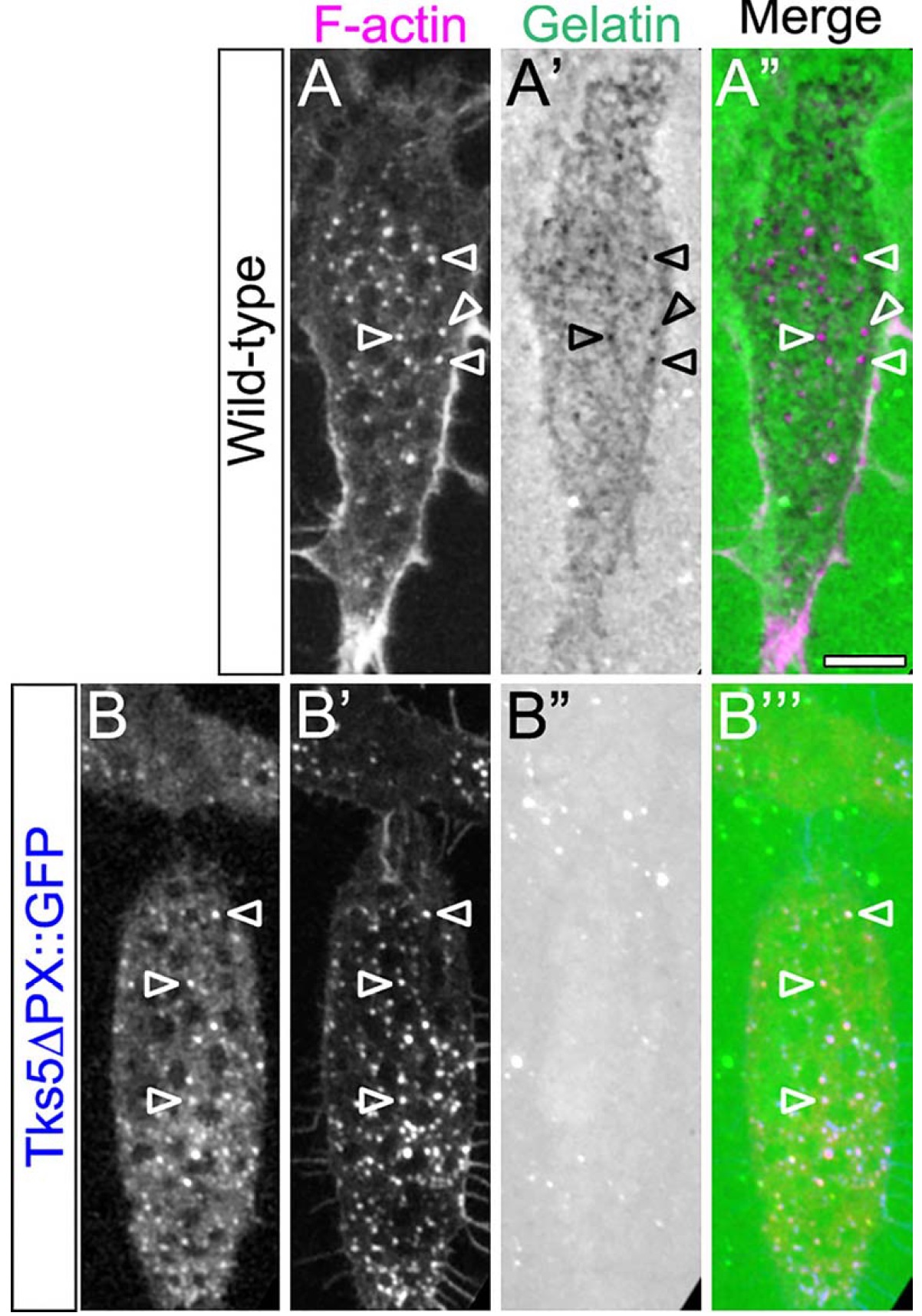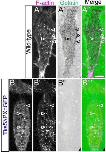 Oikawa, Tks5-dependent formation of circumferential podosomes/invadopodia mediates cell-cell fusion. 2012, Pubmed