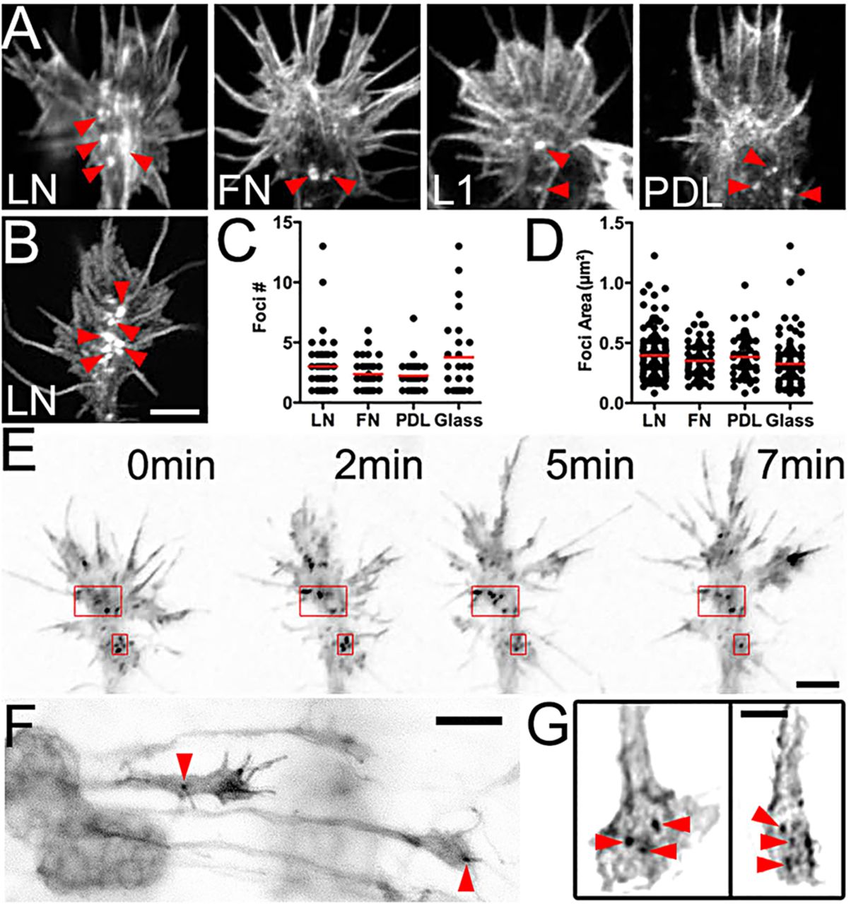 Fig. 1. Growth cones contain F-actin-rich foci within their central domain in vitro and in vivo. (A,B) Confocal images of phalloidin-labeled spinal neuron (A) or retinal ganglion cell (B) growth cones with F-actin foci (arrowheads) cultured on different substrata. (C,D). Quantification of foci number (C; nâ¥26) and area (D; nâ¥51) in growth cones on different substrata. Lines represent the mean intensity. (E) TIRF images of a live spinal growth cone on laminin expressing GFP-β-actin. Note stable F-actin foci in the C-domain as the growth cone advances (red boxes). (F,G) Confocal z-series projections of whole-mount Xenopus spinal cords with F-actin-labeled motoneurons and commissural interneurons by using targeted expression of mCh-UtrCH. (F) Lateral view shows motoneuron axons extending along the ventral fascicle with F-actin foci (arrowheads). (G) Ventral view of a spinal cord showing commissural interneuron growth cones at the midline. Scale bars: 5â µm (A,B,E,G); 10â µm (F). FN, fibronectin; LN, laminin; PDL, poly-d-lysine. |