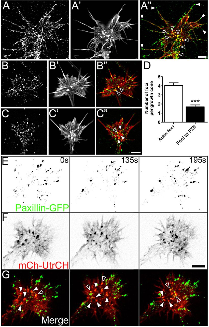 Fig. 2. F-actin foci colocalize with β1 integrin receptors and the PC proteins PXN and FAK in growth cones. (A-C) Confocal microscopy images of growth cones cultured on laminin and immunolabeled for β1 integrin (A), pY118-PXN (B) or pY397-FAK (C). (Aâ²-Câ²) Phalloidin staining. (Aâ²-Câ²) Merged images of immunolabeling (green) and F-actin staining (red). Note that β1 integrin targets to filopodia tips (solid arrowheads), as well as to F-actin foci (open arrowheads). Also note that pY118-PXN and pY397-FAK colocalize with some (open arrowheads), but not all, F-actin foci (solid arrowheads). (D) A minority of F-actin foci contain pY118-PXN. ***P<0.001, unpaired t-test, n=68. (E,F) Inverse contrast TIRF images of a live spinal neuron growth cone on laminin expressing both paxillin (PXN)-GFP (E) and mCh-UtrCH (F). (G) In a merged pseudo-colored image, PXN (green) colocalizes with some (open arrowheads), but not all F-actin foci (red, solid arrowheads). Scale bars: 5â µm (A,B,E-G). |