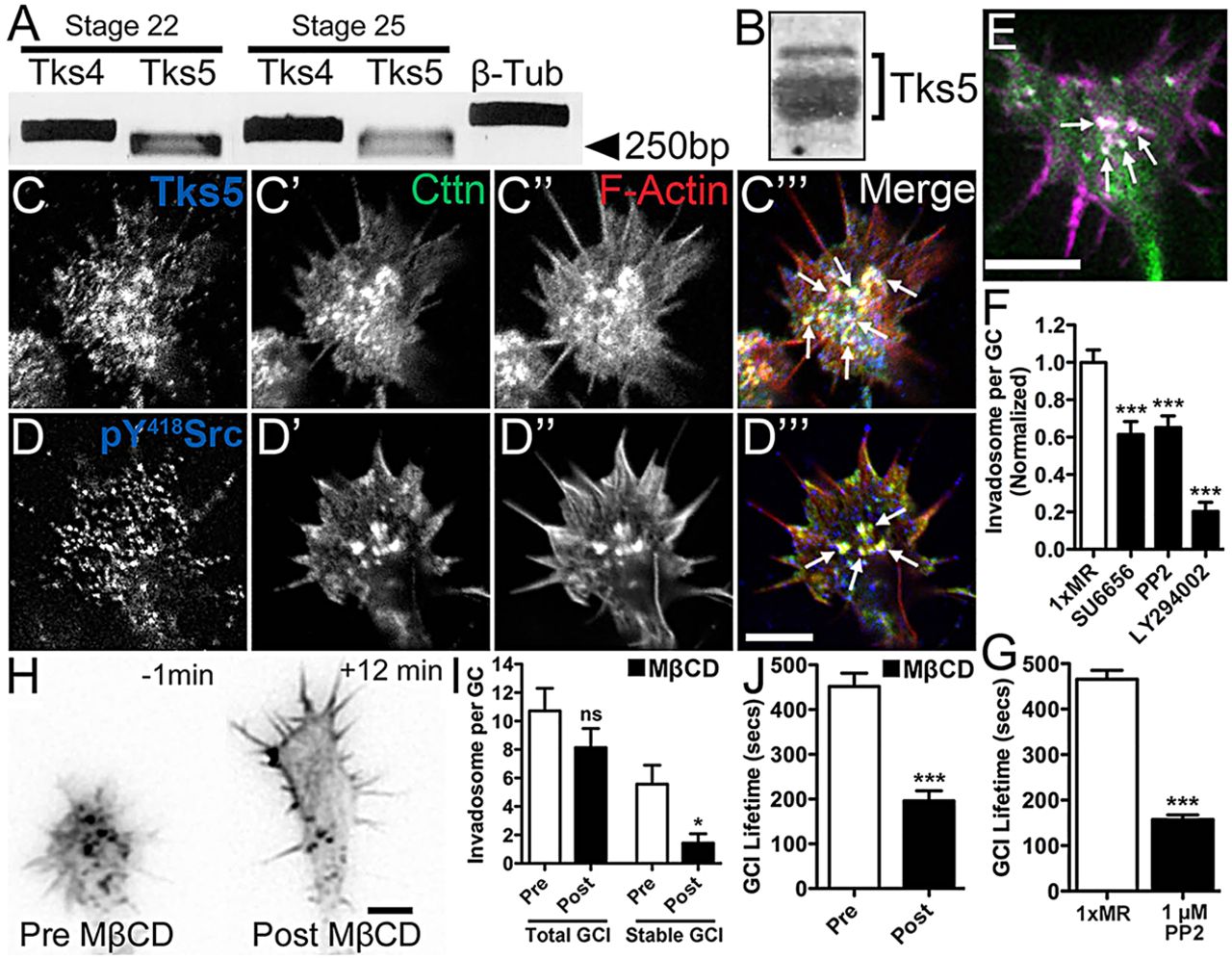 Fig. 5. F-actin foci colocalize with Src and Tks5, and require active Src and lipid rafts for their formation in growth cones. (A) Reverse transcription PCR amplification of Tks4 and Tks5 from stage-22 and stage-25 Xenopus spinal cord. (B) Western blot of Tks5 from stage-24 Xenopus spinal cord. (C,D) Confocal images of growth cones cultured on laminin and immunolabeled for Tks5 (C) and pY418-Src (D). (Câ²,Dâ²) Immunolabeling of Cttn. (Câ²,Dâ²) Phalloidin labeling of F-actin. (Câ´-Dâ´) Merged images of Tks5 or Src (blue), Cttn (green) and F-actin (red). Note colocalization of Tks5 and active Src with Cttn at growth cone invadosomes (arrows). (E) TIRF image of a live growth cone on laminin expressing both Tks5-GFP (green) and mCh-UtrCH (magenta). Note that Tks5 targets to mCh-UtrCH-labeled F-actin foci (arrows). (F) Invadosome number is significantly reduced by treatment with 5â µM SU6656, 1â µM PP2 or 20â µM LY294002 for 30â min. ***P<0.0001, KruskalâWallis test with Dunn's post-hoc analysis, nâ¥75. (G) Invadosome lifetime in GFP-β-actin expressing growth cones is significantly reduced by inhibition of Src with 1â µM PP2. ***P<0.001, unpaired t-test, nâ¥99. (H) TIRF images of a live growth cone on laminin expressing GFP-β-actin before (left) and after (right) treatment with 2.5â µM MβCD. (I) The number of total (left) and stable (right) invadosomes in GFP-β-actin expressing growth cones is reduced after treatment with 1â µM MβCD. *P<0.05, paired t-test, n=7. (J) Invadosome lifetime in GFP-β-actin expressing growth cones is significantly reduced by cholesterol depletion with 1â µM MβCD. ***P<0.001, paired t-test, nâ¥57. Scale bars: 5â µm (C-E,H). ns, not significant. |