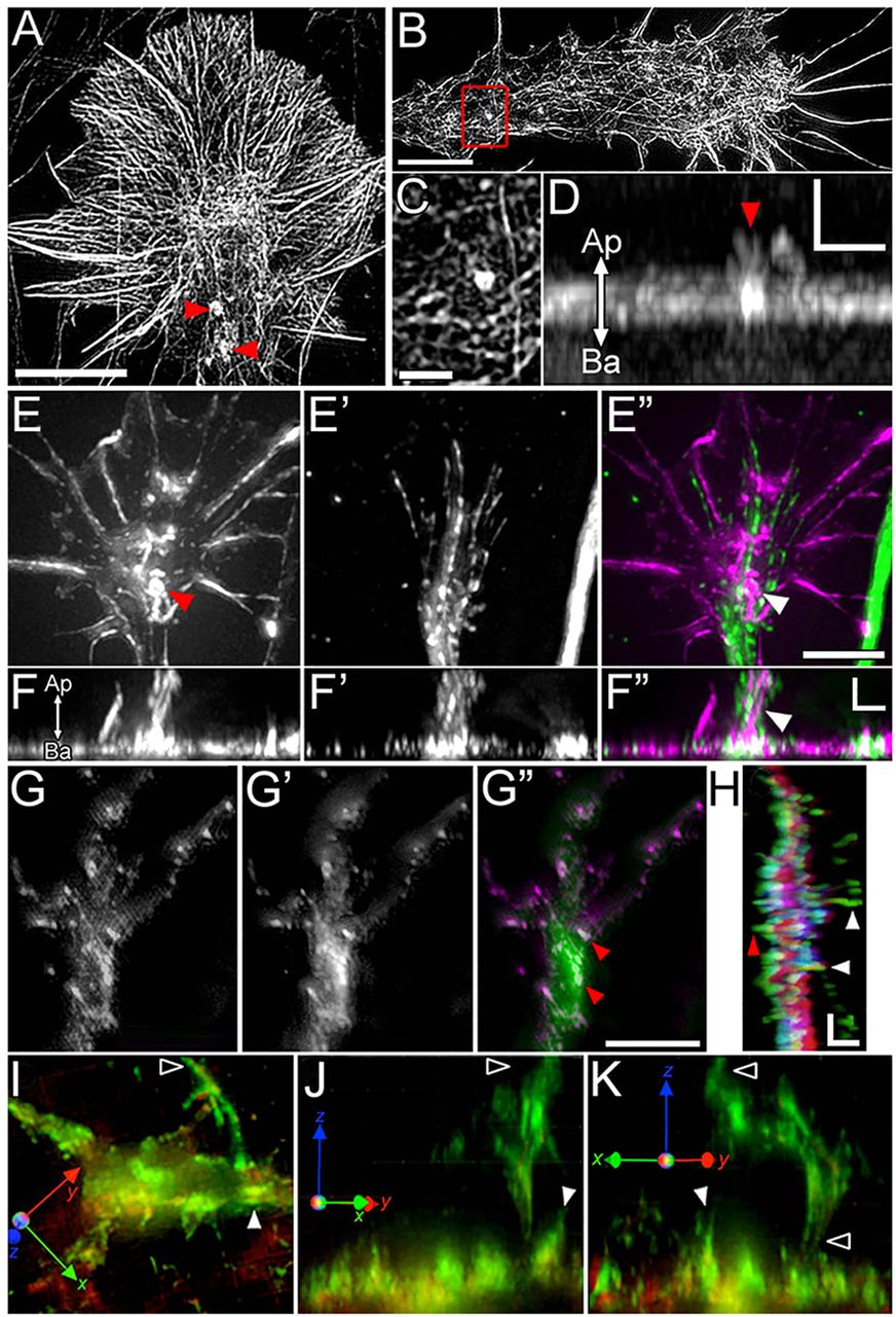 Fig. 6. F-actin-rich protrusion from the central domain of growth cones are detected by 3D SIM. (A,B) SIM images of Xenopus spinal neuron growth cones on laminin (A) or thin gelatin (B), fixed and stained for F-actin with Alexa-568 phalloidin. Note the cross-linked actin meshwork within the peripheral veil and the F-actin-rich foci within the growth cone central domain (arrowhead in A and red box in B). (C) 2.5à zoom of the boxed region in B. (D) Orthogonal view (y-z) through the F-actin-rich foci shown in C. Note this F-actin foci spans from the basal (Ba) substratum to the apical (Ap) membrane where it protrudes from the growth cone surface (arrowhead). (E,Eâ²) SIM images of an iPSC-derived human forebrain neuron growth cone on laminin, fixed and stained for F-actin with Alexa-568 phalloidin (E) and immunolabeled for βIII-tubulin (Eâ²). Note the F-actin-rich foci located within the growth cone central domain (arrowhead). (Eâ²) Merged image of F-actin (magenta) and βIII-tubulin (green) labeling. (F-Fâ²) Orthogonal view (x-z) images through the F-actin-rich foci shown in E-Eâ². Note how MTs track along F-actin within the apical protrusion (arrowhead). (G-Gâ²) 3D SIM images of a Xenopus spinal neuron growth cone in a collagen-I gel stained for F-actin (G) with phalloidin and immunolabeled for Cttn (Gâ²). Note in the merge image (Gâ²) F-actin-rich foci (purple) within the C-domain colocalize with Cttn (green, arrowheads in Gâ²). (H) Orthogonal view of a triple-labeled growth cone (Cttn, green; F-actin, red; βI+II tubulin, blue) in a collagen-I gel showing apical (white arrowheads) and basal protrusions (red arrowhead). (I-K) 3D SIM images of a peripheral Rohon-Beard growth cone in the skin immunolabeled for NCAM (green) and Cttn (red) and viewed at three orientations. Cttn-containing NCAM puncta in the C-domain viewed in x-y (I, solid arrowhead) associates with an apical protrusion viewed as a 90° rotation along the x-axis (J, solid arrowhead). A second prominent apical protrusion (open arrowheads) extends â¼10â µm toward the peripheral skin as seen in a 90° rotation along the y-axis (J,K). Scale bars: 5â µm (A,B,E,G,I(x,y),J(z),K(z)); 1â µm (C,D); 2â µm (F,H). |