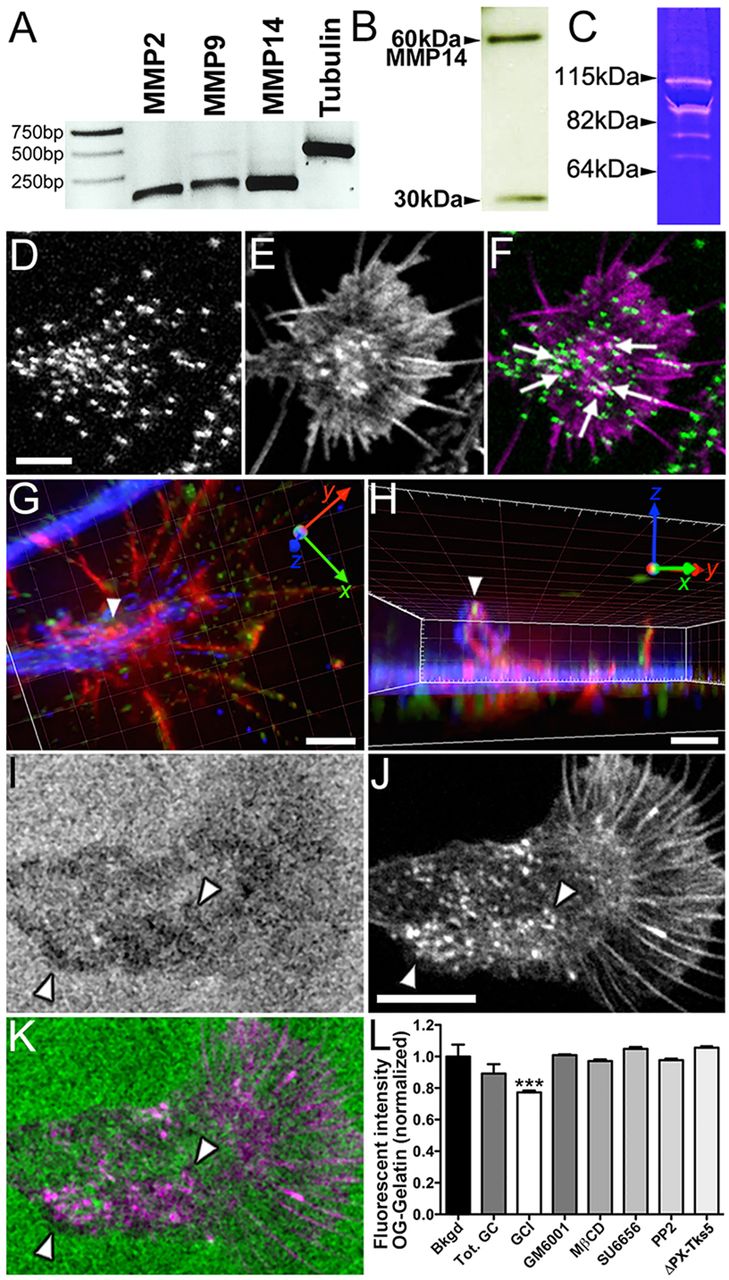Fig. 7. Spinal neurons express MMPs, and growth cones exhibit invadosome-targeted protease activity. (A) Reverse transcription PCR amplification of MMP2, MMP9 and MMP14 from stage-24 Xenopus spinal cord. (B) Western blot of MMP14 from stage-24 Xenopus spinal cord. (C) Gelatin zymogram of MMP9 (â¼90â kDa) and MMP2 (70â kDa) along with their pro-forms (â¼110â kDa and â¼75â kDa, respectively) from stage-24 Xenopus spinal cord. (D-F) Confocal images of a spinal neuron grown on laminin and immunolabeled for MMP14 (MT1-MMP) (D), with F-actin-labeled with phalloidin (E) and an image merge (F) of MMP14 (green) and F-actin (magenta). Note colocalization of MMP14 puncta at F-actin foci (arrows). (G,H) 3D rendering view of SIM images of a human forebrain neuron growth cone (from Fig. 6E) triple-labeled for F-actin (red), βIII tubulin (blue) and ADAM17 (green). A view of the apical surface (G) shows an F-actin foci in the central domain (arrowhead), which is revealed to be an apically directed protrusion in a lateral view (H) with ADAM17 at the protrusion tip (arrowhead). (I-L) Gelatin degradation by a spinal neuron growth cone occurs near F-actin foci. (I) Oregon Green gelatin used as the substratum. (J) Growth cone labeled with Alexa-546 phalloidin. (K) Merged image of the gelatin (green) and F-actin (magenta) labels. Note colocalization of F-actin foci with areas of gelatin degradation (arrowheads). (L) Quantification of gelatin degradation for the total growth cone (Tot. GC) and at growth cone invadosomes (GCI) compared to background fluorescence. Gelatin degradation at invadosomes was inhibited by treatment with 10â µM GM6001, 2â µM PP2, 5â µM SU6656, 2.5â µM MβCD and in growth cones expressing δPX-Tks5-GFP. ***P<0.0001, KruskalâWallis test with Dunn's post-hoc analysis, nâ¥22. Scale bars: 5â µm (D-F); 3â µm (G,H); 10â µm (I-K). |