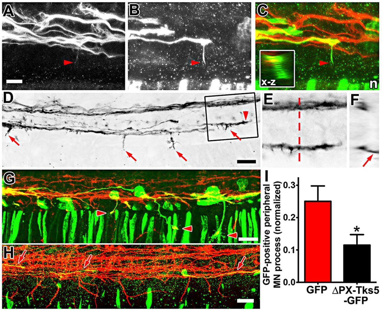 Fig. 8. Motoneuron growth cones in the spinal cord extend invadosome-like protrusions toward the peripheral myotome, which are necessary for proper axon extension into the periphery. (A,B) Maximum z-series projected images of a whole-mount embryo (lateral view, anterior left) with descending motoneuron growth cones on the ventral fascicle labeled with GFP by using targeted blastomere injection. This embryo was immunolabeled for βI+II tubulin (A) and GFP (B). (C) Merged image of motoneurons labeled for tubulin (red) and GFP (green) showing a robust protrusion that extends toward the notochord (n) from the central domain of the lead growth cone. Note that a MT has polymerized into this invadosome-like protrusion (A, arrowhead) that extends diagonally away from the spinal cord, as seen in an x-z view (C, inset). (D) Maximum z-series projected image (inverted contrast) of a whole-mount embryo (lateral view, anterior left) immunolabeled with the Znp-1 antibody. Note several peripheral axons and fine protrusions extend from motoneurons (arrows). (E) Magnified image from the boxed region in D shows a terminal motoneuron growth cone with many fine protrusions. (F) x-z view resampled along the dashed line in E shows an invadosome-like protrusion that extends deep into the lateral tissue (arrow). (G,H) Maximum z-series projected images of whole-mount embryos (lateral view, anterior left) expressing GFP (G) or δPX-Tks5-GFP (H) in motoneurons. Embryos were immunolabeled for βI+II tubulin (red) and GFP (green). Note that several peripheral GFP-expressing motoneuron axons with growth cones (G, arrowheads) have exited the spinal cord en route to the peripheral myotome, whereas motoneurons expressing δPX-Tks5-GFP remain within the spinal cord (H, arrows). (I) The percentage of tubulin-positive peripheral motoneuron axons that express δPX-Tks5-GFP is significantly less than that expressing GFP in control embryos (see Materials and Methods). *P<0.05, Fisher's exact test. The n values for numbers of peripheral axons (tubulin-positive, GFP-positive), image z stacks and embryos, respectively, are 64, 14, 28, 7 for control and 140, 16, 32, 8 for experimental conditions. Scale bars: 10â µm (A-C); 30â µm (D,G,H). |