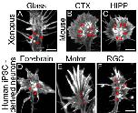 Fig. S1. Mouse and human neuronal growth cones form F-actin rich foci. F-actin in growth cones was labeled with fluorescent phalloidin and imaged by confocal microscopy. A. A Xenopus spinal neuron growth cone cultured on bare glass. B-C. Mouse embryonic cortical (B) and hippocampal (C) growth cones on PDL-L1. D-F. Growth cones of human forebrain (D), motor (E) and RGC (F) neurons differentiated from iPSCs and plated on PDLLN. Note F-actin rich foci located within the C-domain of all growth cones (arrowheads). Scale, 5 μm (A-F). |
