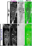 Fig. 4. F-actin foci colocalize with Cttn and other invadosome modulators within growth cones. (A-D) Confocal images of growth cones cultured on laminin and immunolabeled for Cttn (A), Arp3 (B), N-WASP (C) and Mena (D). (Aâ²,Dâ²) Phalloidin labeling of F-actin. (Aâ²-Dâ²) Merged images of the immunolabeling (green) and F-actin labeling (red). Note the strong colocalization of F-actin foci with immunolabeled proteins (arrowheads). (E-Eâ²) TIRF images of a live growth cone on laminin expressing both GFP-α-actinin (E) and mCh-UtrCH (Eâ²). Note in the merged image (Eâ²) that α-actinin targets to mCh-UtrCH-labeled F-actin foci (arrowheads). Scale bar: 5â µm. |