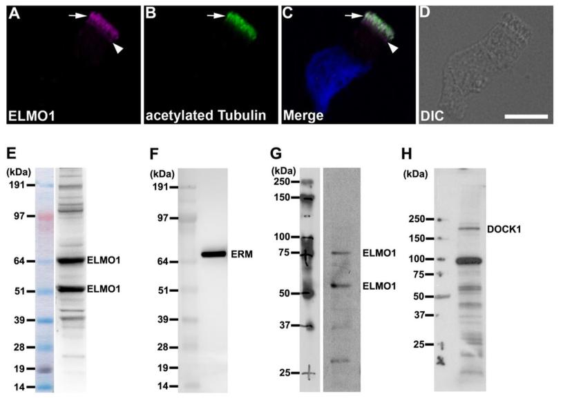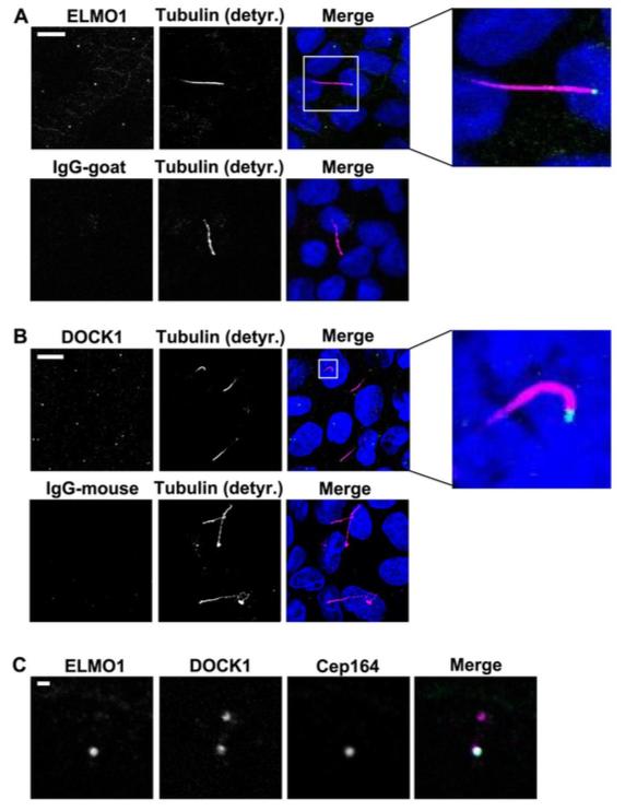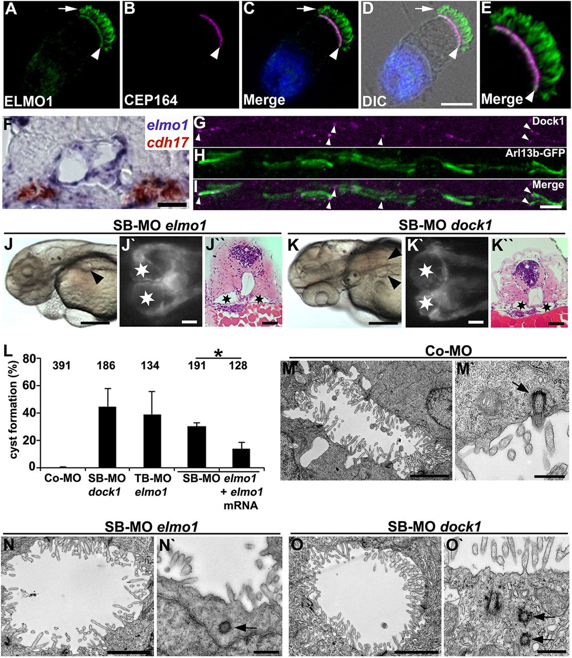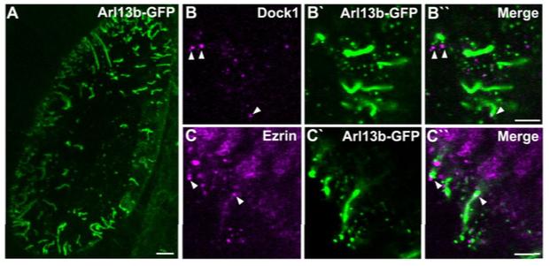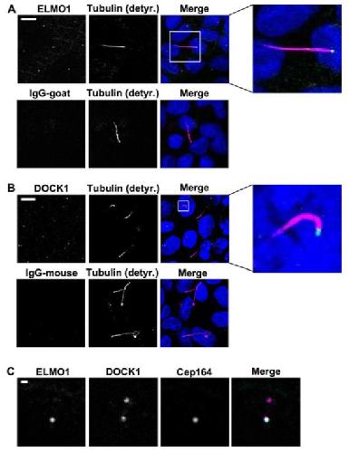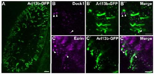 Genes referenced: arl13b cep164 dock1 elmo1 elmo2 ezr msn psmd6 rac1 tuba4a tubg1