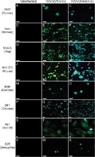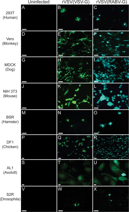 Figure 2. A variety of cell lines from different organisms were infectable with VSV vectors. Cells were infected with either rVSV(VSV‐G) or rVSV(RABV‐G) and assayed for Venus or GFP fluorescence at 1 dpi. Chamber slides of (A–C) human 293T cells, (D–F) Vero monkey cells, (G–I) dog MDCK cells, (J–L) mouse NIH 3T3 cells, (M–O) hamster BSR cells, (P–R) chick DF1 cells, (S–U) salamander AL1 cells, or (V–X) Drosophila S2R cells were infected with 1 μL of 1 × 105 ffu/mL of either rVSV(VSV‐G) (B,E,H,K,N,Q,T,W), or rVSV(RABV‐G) (C,F,I,L,O,R,U,X). The virus used to infect is indicated above the panels. Negative controls (A,D,G,J,M,P,S,V) were not exposed to virus. Scale bars = 50 μm. |
