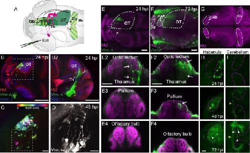 Figure 6. Transsynaptic labeling of the visual pathway in larval zebrafish infected with rVSV(VSV‐G). (A) Diagram of unilateral eye injection. RGC axons (red arrows) project contralaterally to the optic tectum, pretectum, and thalamus. The locations of rVSV(RABV‐G)‐infected cells are indicated by green shaded areas. Putative axonal projections from the OT to the pallium, habenula, and cerebellum are labeled as dashed arrows. (B–D) rVSV(VSV‐G) infection of the OT. Dorsal (B) and lateral (B2) views of a 24 hpi zebrafish stained for Venus (green), HuC/D (red, pan‐neuronal marker), and HNK1 (blue, neuropil). Labeled RGC termini and tectal cell bodies can be seen in the right (contralateral) tectum. Boxed area in B is shown at higher magnification in C. Spectrum of colors represents depth from the dorsal surface of the tectum (red‐yellow) to the ventral surface (blue‐pink) for Venus‐labeled cells. (D) High magnification of contralateral Venus‐labeled tectal cells at 48 hpi, in location similar to C (boxed area). The majority of the labeled tectal neurons had a single process extending medially, consistent with the previously described morphology of retinorecipient neurons (Robles et al., 2011). (E,F) Dorsal views of confocal maximal projections show rVSV(VSV‐G) labeling at 24 hpi (E) and 72 hpi (F). Areas delineated by dashed lines are the OT, habenula, and olfactory bulb. Transverse optical sections from each stage are shown in panels below (E2–E4 for 24 hpi and F2–F4 for 72 hpi). (G–I) Dorsal view of the zebrafish brain (3 dpf), stained with HuC (G). Areas delineated by dashed lines are the habenula and cerebellum, which are shown at higher magnification in H and I, respectively. 24 hpi labeling was restricted to the optic tectum, pretectum, and thalamus. At 72 hpi, labeling broadened and included cells in the pallium (F3), habenula (H), and the cerebellum (I). Labeled cells are indicated by white arrows or arrowheads and axons are labeled with yellow arrowheads). Venus‐expressing cells were not present in the olfactory bulb (E4, F4). CB: cerebellum, HAB = habenula, Me = medulla, OB = olfactory bulb, OT = optic tectum, P = pallium, PT = pretectum, Th = thalamus. Scale bars = 100 μm in B–B2; 20 μm in C,D; 50 μm E–F4; 20 μm in H,I. |