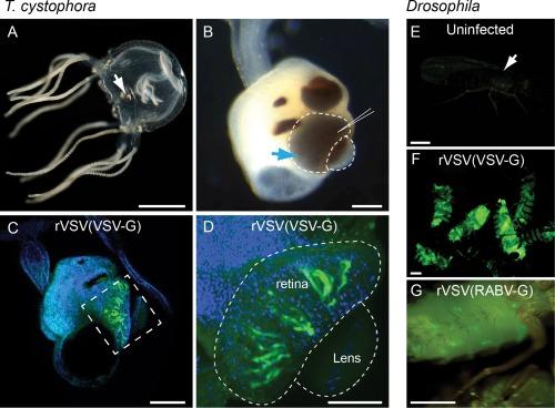 Figure 10. Recombinant VSV vectors can infect invertebrate organisms. (A,B) Image of the box jellyfish, Tripedalia cystophora (A). The visual system is comprised of four sensory structures, or rhopalia (white arrow in (A). Image in (B) shows higher magnification of rhopalium in (A). There are six eyes located on each rhopalium, two of which are camera‐type lens eyes (blue arrow, B). The vitreous space of the lower lens eye was injected with rVSV(VSV‐G) (injection site indicated by needle in B) and the infection was monitored for a total of 7 dpi. (C,D) Photoreceptors in all 10 injected animals expressed Venus by 2 dpi. (C) Lateral view of entire rhopalium, with orientation as in (B), shows Venus expression in the photoreceptors of the lower lens eye (C, boxed area). Green = Venus, blue = DAPI. (D) Higher magnification of boxed region in C showing rVSV(VSV‐G) infection in retinal photoreceptors of the everted lens eye (dashed lines). Images taken at 2 dpi. (E–G) Recombinant VSV vectors could also infect Drosophila melanogaster. (E) Uninfected flies were nonfluorescent, while those infected with rVSV‐Venus(VSV‐G) (F) or rVSV‐GFP(RABV‐G) (G) showed fluorescent protein expression. Images taken 1 dpi. Scale bars = 5 mm in A; 100 μm in B,C; 50 μm in D; 0.5 mm in E–G. |