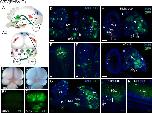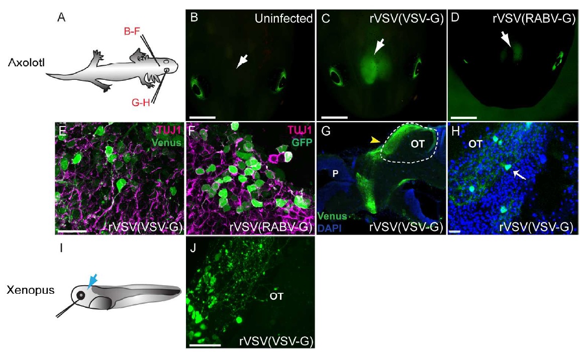 Figure for Editor: Recombinant VSV vectors can be used to transneuronally trace neurons in axolotls and Xenopus. (A) Schematic of injections into axolotl. (B-D) Recombinant VSV vectors can infect neurons when injected directly into the brain. Arrowheads in B-D indicate the brain of each animal. An animal injected with saline as a control is shown in (B). Note that the eyes are autofluorescent. (E-F) Sections of the medial pallidum of axolotl brains infected directly with either (E) rVSV(VSV-G) or (F) rVSV(RABV-G). Many infected cells co-stain with the anti-Tuj1 antibody, suggesting that both vectors can infect neurons. (G-H) A parasaggital image of an axolotl brain shows evidence of viral infection in the optic tectum (OT) (G). 100 nL of 1 x 1010 ffu/mL rVSV(VSV-G) were injected into the right eye, animals were sacrificed at 6 dpi (G) or 3 dpi (H). Infected cells and processes were observed in multiple areas in the brain, including within cells of the OT (white arrow in H) and in RGC axons (yellow arrowhead in G). (I) Schematic of injections into Xenopus embryos. Animals were injected with 100 nL of 1 x 1010 ffu/mL rVSV(VSV-G) into the right eye at 3 dpf, and allowed to incubate for 3 days. (J) As seen in zebrafish, virally labeled cell bodies could be observed in the contralateral OT. Scale bars: B-D = 3 mm; E, F, J = 50 μm; H= 7 μm. |
