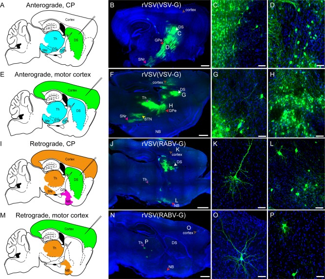 Figure 1. rVSV(VSV‐G) transmission shows an anterograde, and rVSV(RABV‐G) shows a retrograde, polysynaptic pattern of transmission among neurons in mice. (A–H) rVSV(VSV‐G) was injected into the dorsal striatum (DS) (A–D) or primary motor cortex (E–H), and animals were sacrificed 3 dpi. (A) Schematic of regions expected to be labeled by anterograde transsynaptic transmission (blue) of a virus from a DS injection (injection needle, green). (B–D) At 3 dpi, DS injections of rVSV(VSV‐G) resulted in patterns of infection consistent with anterograde transsynaptic transmission. Infected cells were observed near the injection site in the DS (white arrowhead), as well as in the GPe (red arrowhead), SNr (pink arrowhead), and the thalamus. The cortex, which projects to the DS, was not labeled (brown arrowhead). Higher‐magnification images of neurons in the DS (C) and GPe (D) are shown. (E) Schematic of regions expected to be labeled by anterograde transsynaptic transmission (blue) of a virus from a primary motor cortex injection (injection needle, green). (F–H) Injection of rVSV(VSV‐G) into the primary motor cortex labeled cells locally in the cortex (brown arrowhead), and the same regions as a direct DS injection, including the DS (white arrowhead), GPe (red arrowhead), STN (yellow arrowhead), SNr (pink arrowhead), and thalamus (purple arrowhead). High‐magnification images of DS neurons (G), and neurons in the GPe (H) are provided. (I) Schematic of regions expected to be labeled by initial infection by retrograde uptake, and/or by retrograde transsynaptic transmission (orange), with the nucleus basalis (NB) predicted to be labeled only by retrograde transmission (magenta) of rVSV(RABV‐G) from a DS injection (injection needle, green). (J–L) rVSV(RABV‐G) was injected into the DS. At 3 dpi, this injection resulted in infected cells in retrograde targets, including local infection in the DS (white arrowhead), cortex (brown arrowhead), NB (red arrowhead), and the thalamus (purple arrowhead). High magnifications of a cortical neuron (K), and NB neurons (L) are shown. (M) Schematic of regions expected to be labeled by initial infection by retrograde uptake, and/or by transsynaptic transmission (orange) of a retrograde virus from a primary motor cortex injection (injection needle, green). (N–P) Injections of rVSV(RABV‐G) into the primary motor cortex labeled neurons at the injection site in the cortex (brown arrowhead), as well as the NB (red arrowhead) and thalamus (purple arrowhead), but not the DS. Higher magnification of a cortical neuron (O) and thalamic neurons (P) are shown. Multiple types of neurons, including glutamatergic (e.g., cortical pyramidal neurons, panels K,O), GABAergic (DS medium spiny neurons, panels C,G), and cholinergic (NB neurons, panel L), were labeled. DS = dorsal striatum, Th = thalamus, STN = subthalamic nucleus, GPe = globus pallidus external segment, SNr = substantia nigra pars reticulata, NB = nucleus basalis. Scale bars = 1 mm in B,F,J,N; 50 μm in C,D,G,H,K,L,O,P. |