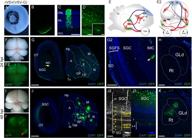 Figure 3. In ovo rVSV(VSV‐G) infection of the chicken eye shows an anterograde transsynaptic pattern of spread. (A–D) Injection of rVSV(VSV‐G) into the left eye of E14 chicken embryos resulted in viral gene expression in the retina (A,B). Transverse section through an infected retina at 48 hpi showing a column of labeled photoreceptor cells and associated GFP‐positive cells. Labeled cells were found in the outer nuclear layer (ONL) and inner nuclear layer (INL), but were absent from RGCs within these columns (C). This columnar transmission pattern was only detected near the injection site. In the posterior area of the retina in C, whole‐mount confocal images show a large number of labeled RGCs with axons directed towards the optic fissure (D). Inset in D shows high magnification of a labeled RGC. (E–E2) Schematic of expected anterograde transsynaptic transmission of rVSV(VSV‐G) through the tectofugal (E,E2, red arrows) and thalamofugal (E,E2, blue arrows) visual pathways illustrated in parasagittal (E) and dorsal (E2) views. (F–K) The pattern of virus infection in whole brains at 24 hpi (F–F2) and 48 hpi (I–I2) after unilateral injection of rVSV(VSV‐G) into the left eye. Red arrow (I2) indicates fluorescent protein expression in the OT. Sagittal sections at 24 hpi show the pattern of rVSV(VSV‐G) transmission within the brain (G). Labeled RGC axons were present in the stratum opticum (SO) of the optic tectum (OT), and sparse labeled cell bodies were detected in the SGFS, IMC (G,G2) and the Rt (H). A few labeled cells were also detected within the GLd (H). At 48 hpi, fluorescent protein expression was greatly increased within primary, secondary, and higher order sites of the visual pathways (J). Higher‐magnification confocal image of the OT with DAPI staining to highlight tectal layers (J2) and detection of viral infection (J3) shows rVSV(VSV‐G) transmission to retinorecipient layers of the SGFS and the SGC output layer of the OT (J3). As compared to expression at 24 hpi (H), fluorescent protein expression was greatly increased within the GLd and the Rt at 48 hpi (K). A = arcopallium, AI = Arcopallium intermedium, E = entopallium, GCL = ganglion cell layer, GLd = dorsal lateral geniculate nucleus, GP = globus pallidus, H = hyperpallium, Hp = hippocampus, IMC = nucleus isthmi pars magnocellularis, INL = inner nuclear layer (of retina), LSt = lateral striatum, M = mesopallium, N = nidopallium, OT = optic tectum, ONL = outer nuclear layer (of retina), Rt = nucleus rotundus, SGC = stratum griseum central (of OT), SGFS = stratum griseum et fibrosum superficiale (of OT), St = striatum, SAC = stratum album central (of OT), SGP = stratum griseum periventriculare (of OT), SO = stratum opticum (of OT), Tn = nucleus teaniae, VL = ventricular layer (of OT). Scale bars = 50 μm in C,D; 1 mm in G,J; 300 μm in G2,H,K; and 100 μm in J2,J3. |