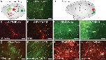 Figure 8. rVSVs can infect squirrel monkeys and macaques. (A) Schematic drawing of a squirrel monkey brain, indicating location of the injection sites in primary visual cortex of monkey #1 (dark green), in the motor cortex (light green), and in the somatosensory cortex (red) of monkey #2. Arrows indicate projections originating at the site of the motor cortex injection, small red and green dots represent retrogradely labeled neurons from the sites of somatosensory and visual cortex injections, respectively. The area demarcated by the red oval corresponds to the nucleus basalis of Meynert (NBM) (B) A GFP‐expressing neuron in the visual cortex after injection of rVSV(RABV‐G) encoding GFP into the primary visual cortex in monkey #1. This pyramidal neuron is located ∼3 mm dorsal to the injection site and is presumably labeled by retrograde uptake of the primary inoculum. (C,D) Neuronal labeling by presumed retrograde uptake after injection of an mCherry‐encoding rVSV(RABV‐G) into the primary somatosensory cortex in monkey #2. (C) Labeled pyramidal neuron in cerebral cortex ∼3 mm dorsal to the injection site. (D) Presumptive cholinergic neurons in basal forebrain nucleus of Meynert. (E,F) Results of the injection of rVSV(VSV‐G)‐expressing Venus into the primary motor cortex of squirrel monkey #2. (E) Labeled pyramidal neurons and interneurons at the injection site. (F) Venus was seen in the axons originating from the infected neurons at the injection site, projecting away from cortex into the white matter going towards internal capsule. (G–K) Labeling of cortical neurons after rVSV injections into the primary visual area in a macaque monkey. (G) Schematic drawing of a macaque brain showing injection sites of rVSV(VSV‐G) (dark green) and rVSV(RABV‐G) (red) in the primary visual cortex. Small red and green dots represent location of rVSV(VSV‐G) (green) or rVSV(RABV‐G) (red) labeled neurons from the sites of somatosensory and visual cortex injections (H,I) Labeled neurons near the site of injection of rVSV(VSV‐G) encoding Venus into V1. (J,K) Labeled neurons near the site of injection of rVSV(RABV‐G) encoding mCherry into V1. FC = central fissure; FS = Sylvian fissure; NBM = nucleus basalis of Meynert; STS = superior temporal sulcus, V1 = primary visual cortex. Scale bars = 50 μm in B,C,E,G–J; 100 μm in D,F. |
