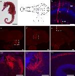 Figure 9. rVSV(VSV‐G) can infect seahorse retinae and allows mapping of retinorecipient areas in the brain. (A) Skeletal preparation of a seahorse (Hippocampus erectus) and schematic drawing of a seahorse skull with the brain. Dashed lines indicate approximate brain regions for sections in C–E. (B) Injection of rVSV(VSV‐G) into the retina resulted in infection of various retinal cell types (3 dpi). (C–E) Brain sections depicting labeled RGC arbors throughout the seahorse brain, following injection of rVSV(VSV‐G) into the retina. C2, D2, E2 are higher‐magnification images of RGC axons in C–E. A small number of infected cell bodies were detected in the brain. Red = GFP, blue = DAPI. PR = photoreceptors, M = Müller glia, RGC = retinal ganglion cells. Scale bars = 50 μm. |