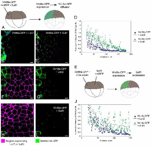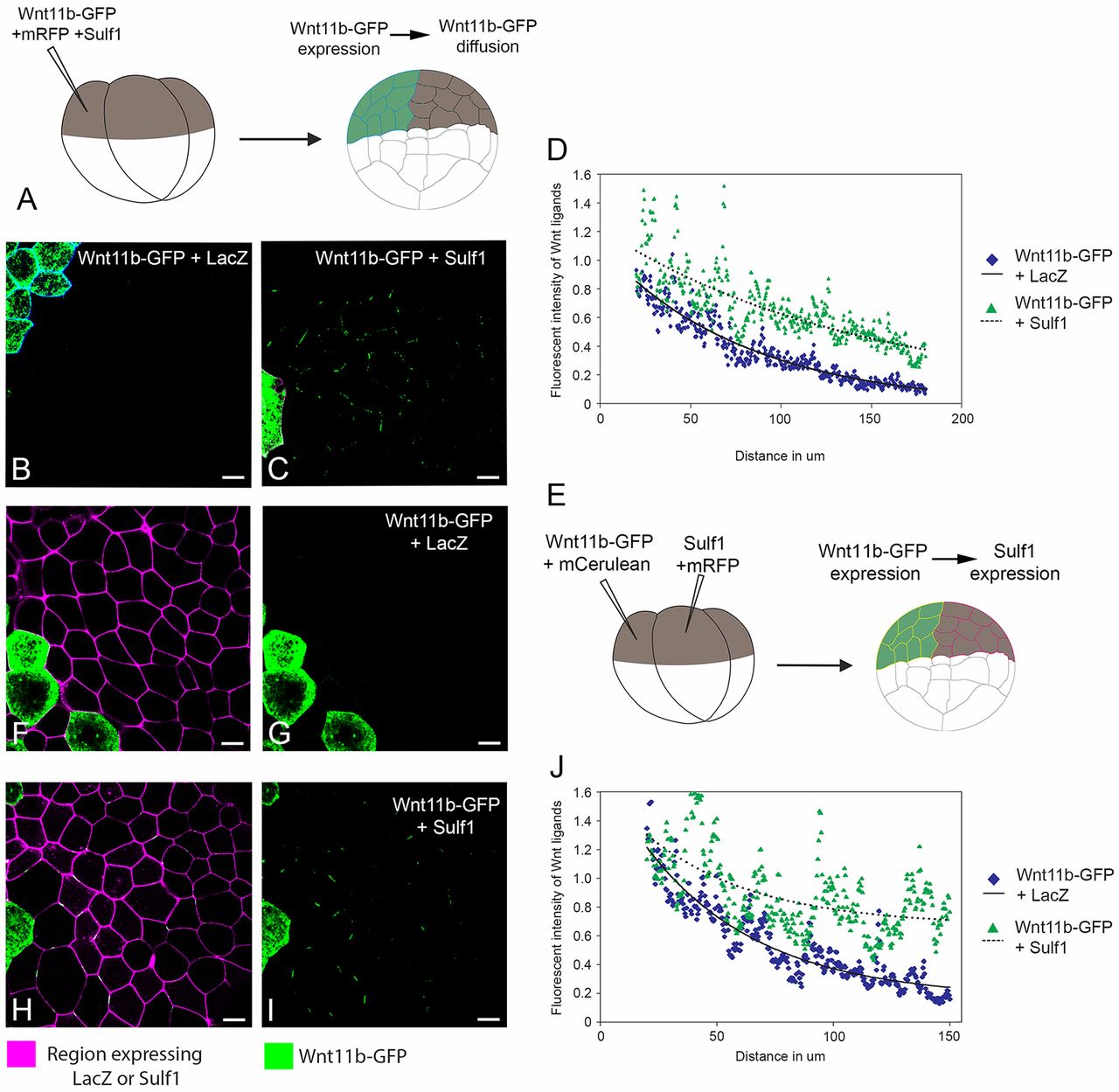 Fig. 8. Sulf1 enhances both the secretion and the amount of Wnt11bâGFP diffusing in animal explants. (A) Diagram depicting the assay used to measure Wnt11bâGFP secretion and diffusion through a control background. (B,C) mRNA encoding either (B) mCerulean (600 pg), LacZ (4 ng) and Wnt11b-GFP (2 ng) or (C) mRFP (600 pg), Sulf1 (4 ng) and Wnt11bâGFP (2 ng) was injected into the animal hemisphere of one blastomere at the four-cell stage. (D) The range of diffusion of Wnt11bâGFP through a control background was quantified using Fiji Image J. (E) Diagram depicting the assay used to measure Wnt11bâGFP diffusion through a background expressing Sulf1. (FâI) mRNA encoding mCerulean (600 pg) and Wnt11bâGFP (2 ng) was injected into the animal hemisphere of one blastomere at the four-cell stage. An adjacent blastomere was injected with mRNA encoding (F,G) mRFP (600 pg) and LacZ (4 ng) or (H,I) mRFP (600 pg) and Sulf1 (4 ng). (J) The range of Wnt11bâGFP through a background expressing either LacZ or Sulf1 was quantified using Fiji Image J. Scale bars: 20 mm. |