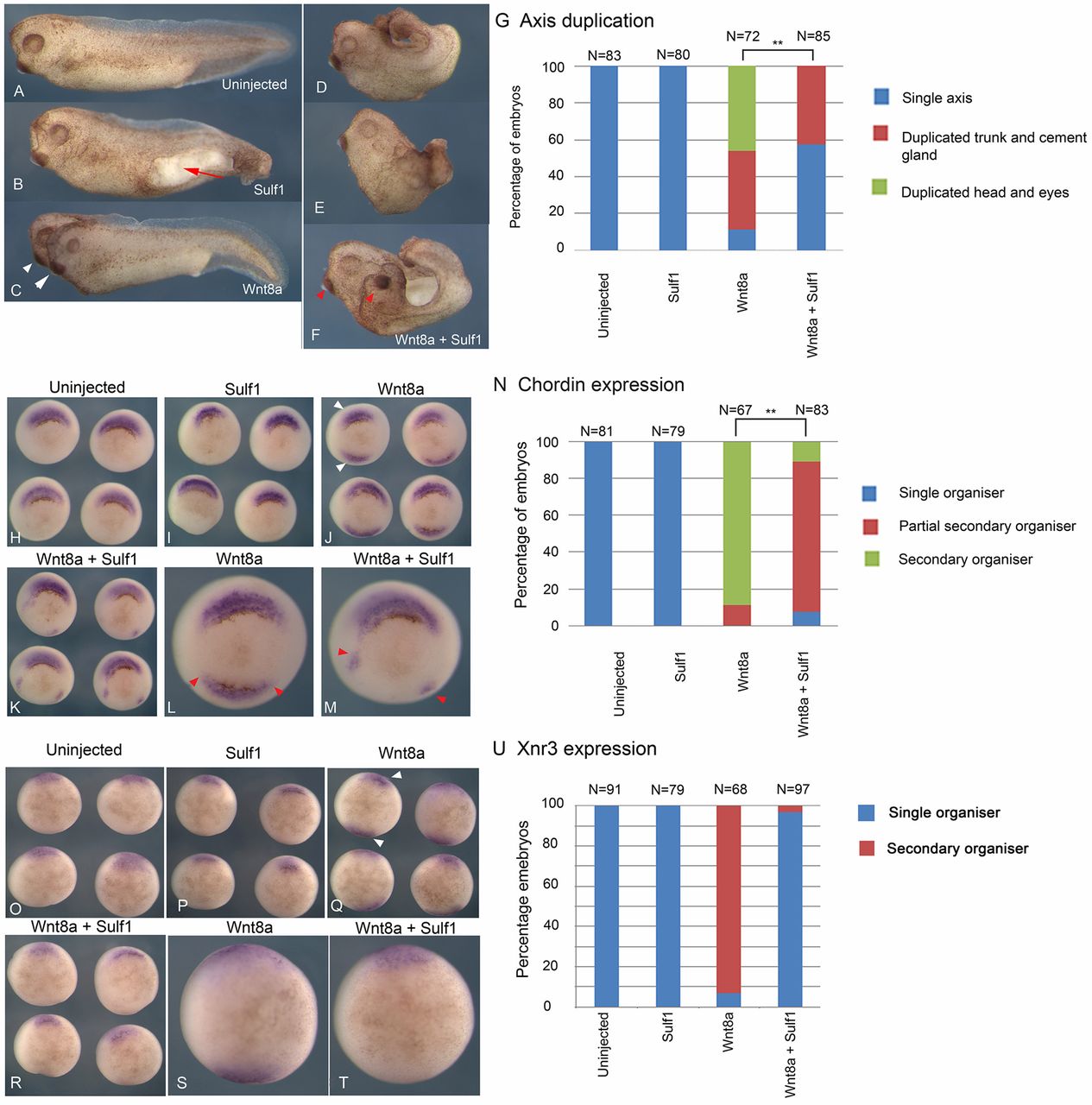 Fig. 1. Sulf1 inhibits the ability of Wnt8a to activate canonical Wnt signalling. (AâM) Xenopus laevis embryos were microinjected with mRNA encoding Wnt8a (5 pg) and/or Sulf1 (1 ng) into a single ventral blastomere at the four-cell stage. (AâF) Whole embryo phenotypes of (A) uninjected control embryo, and embryos injected with (B) Sulf1, (C) Wnt8a or (DâF) Sulf1 and Wnt8a. White arrowheads in C mark a fully duplicated axis; red arrowheads in F mark duplicated trunk and cement gland. (G) The data shown in AâF is quantified in G. **P,0.01 (Chi squared test). (HâM) In situ hybridisation shows the expression of chordin at NF stage 10.5. (H) Uninjected control embryos; (IâK) embryos injected with (I) Sulf1, (J) Wnt8a and (K) Sulf1 and Wnt8a. (L) Wnt8a induces an ectopic domain of chordin expression. (M) Sulf1 inhibits the ability of Wnt8a to induce ectopic chordin resulting in the formation of a partial secondary organiser domain. The red arrowheads in L and M mark the edges of the ectopic chordin domains. (N) The data shown in HâM is quantified in N, **P,0.01 (Chi squared test). (OâU) In situ hybridisation shows the expression of Xnr3 at NF stage 10. (O) Uninjected control embryos; (PâT) embryos injected with (P) Sulf1, (Q) Wnt8a and (R) Sulf1 and Wnt8a. Enlarged images of embryos shown in Q and R are shown in S and T. The data shown in OâT is quantified in (U). N, number of embryos. |