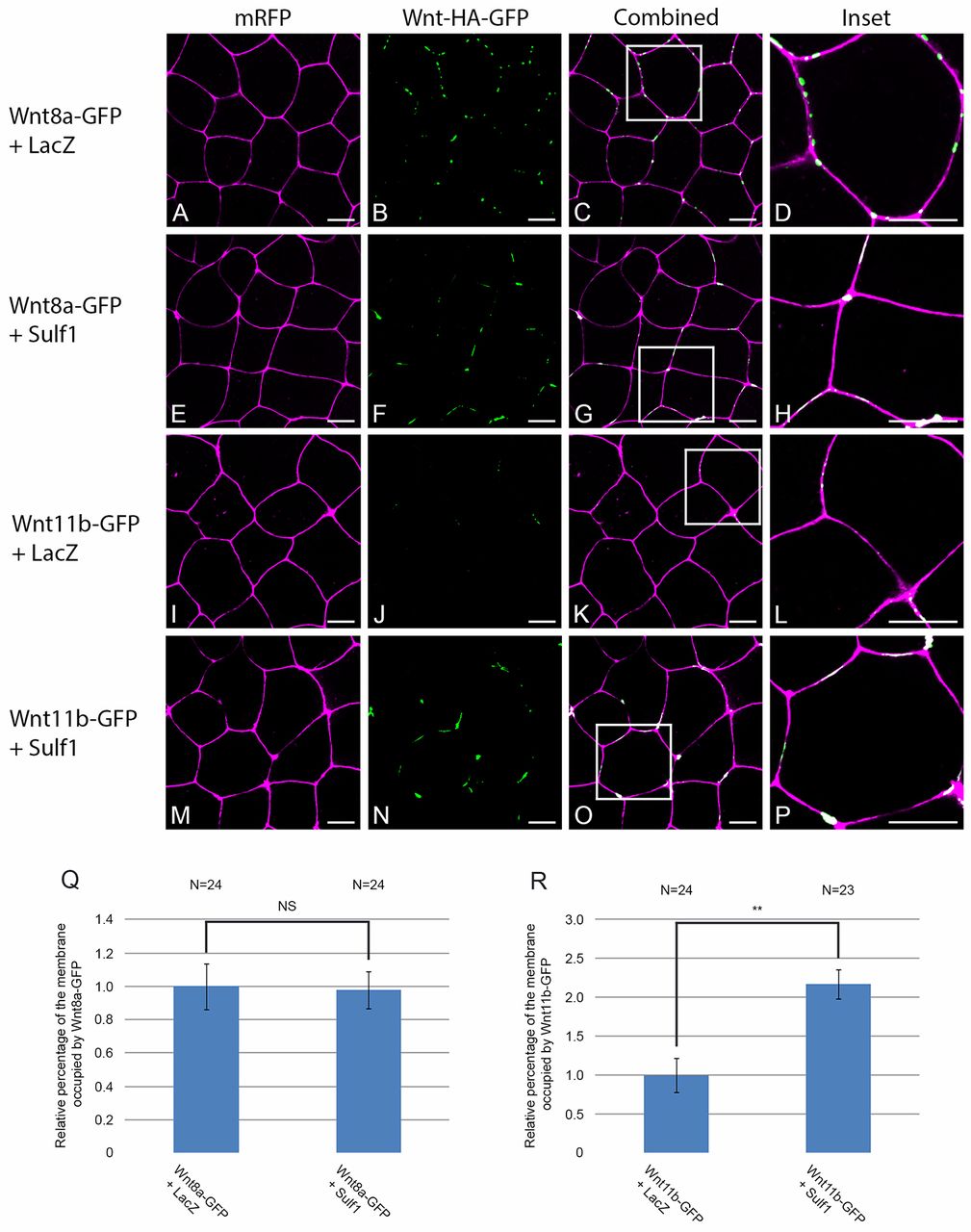 Fig. 6. Sulf1 enhances the accumulation of Wnt11bâGFP on the cell membrane. (AâP) Xenopus laevis embryos were microinjected bilaterally with mRNA encoding mRFP (500 pg) into the animal hemisphere at the two-cell stage. In addition, embryos were injected with mRNA encoding LacZ (4 ng), Sulf1 (4 ng), Wnt8aâ GFP (500 pg), Wnt11bâGFP (1 ng) or a mixture of the four. (AâD) Control animal explants overexpressing LacZ and Wnt8aâ GFP. (EâH) Animal explants overexpressing Sulf1 and Wnt8aâGFP. (IâL) Control animal explants overexpressing LacZ and Wnt11bâGFP. (MâP) Animal explants overexpressing Sulf1 and Wnt11bâGFP. The white boxes in C, G, K and O mark the areas that are enlarged in D, H, L and P, respectively. mRFP is shown in magenta, Wnt8aâ or Wnt11bâGFP is shown in green. Scale bars: 20 mm. (Q,R) Graphs quantifying the relative levels of (Q) Wnt8aâGFP and (R) Wnt11bâGFP on the cell membrane. Data was quantified using a programme written in Matlab, results are mean6s.e.m. **P,0.01; NS, not significant (Mannâ Whitney U test). N, number of embryos. |