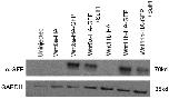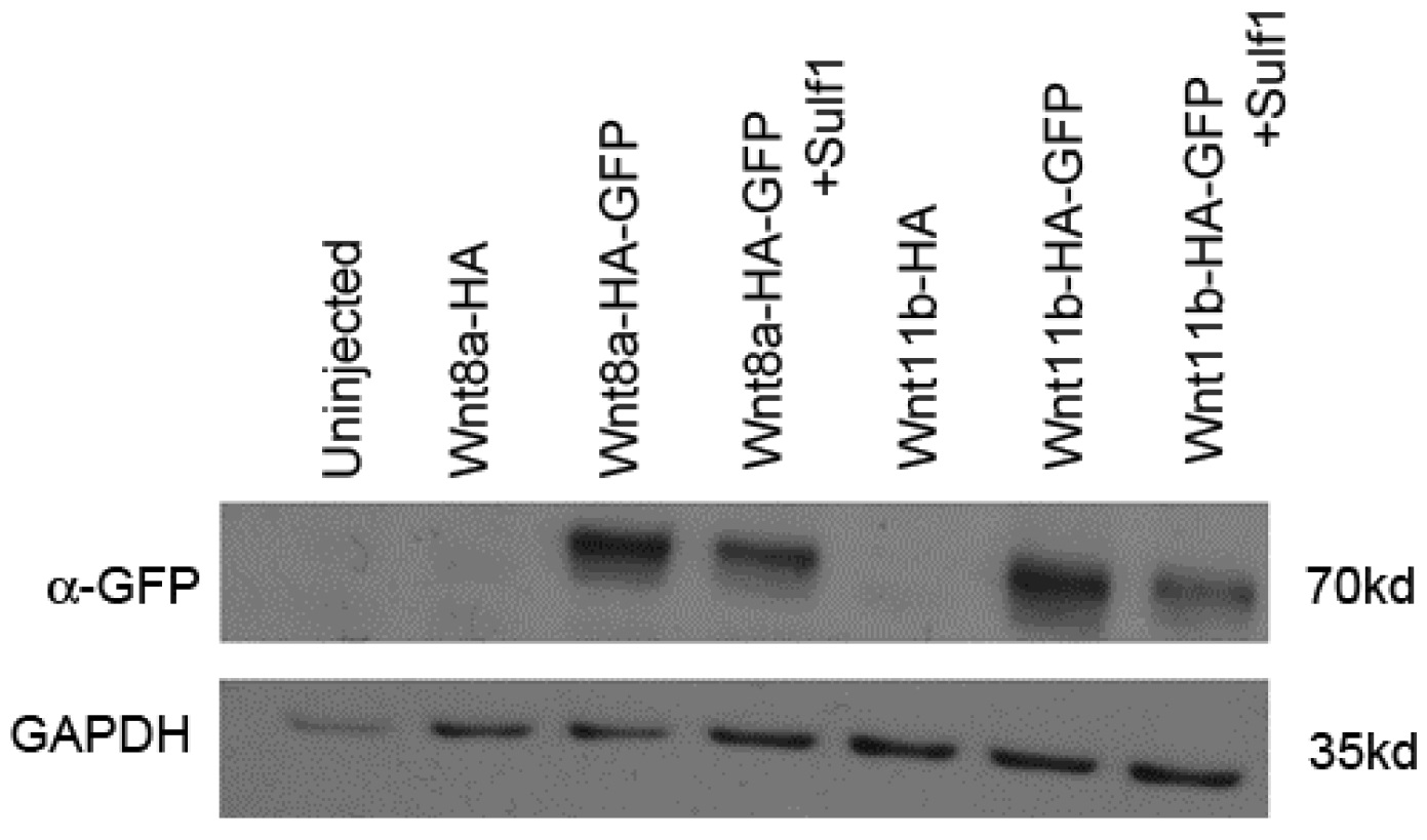 Figure 4 Expression of Wnt8a-GFP and Wnt11b-GFP in Xenopus animal caps. Western blot analysis of Xenopus embryos injected with 400ng of mRNA coding for Wnt fusion proteins (Wnt8a-HA-GFP or Wnt11b-HA-GFP) together with 4ng of mRNA coding for Sulf1 or the control LacZ. Wnt proteins are detected at similar levels in the presence and absence of Sulf1. |