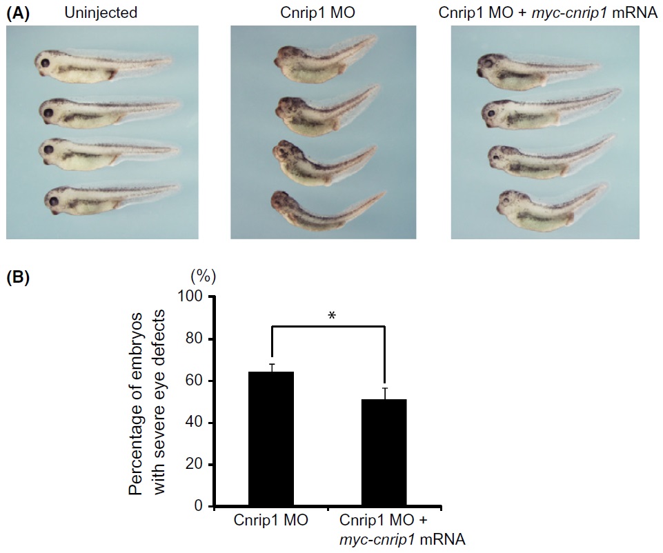 Figure 5 Partial rescue of eye defects in cnrip1 knockdown embryos. Cnrip1 MO (5 ng) was co-injected with or without myccnrip1