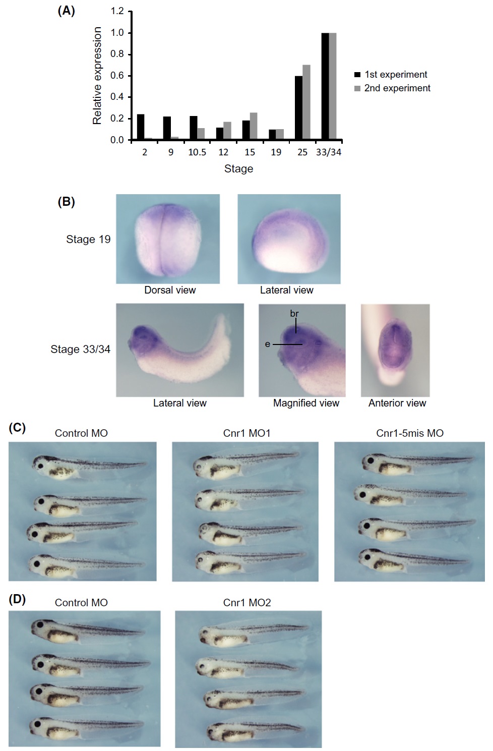 the lower middle panel. e, eye; br, brain. (C, D) Control MO, cnr1 MO1, cnr1-5mis MO or cnr1 MO2 (20 ng each/blastomere)