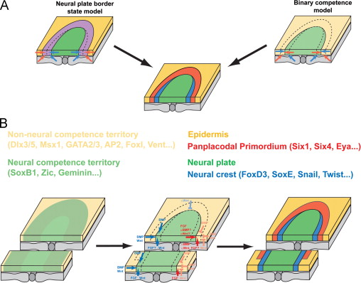 Fig. 1. Dorsoventral ectodermal patterning and induction of panplacodal primordium. (A) Two models have been proposed. According to the âneural plate border state modelâ, neural crest and panplacodal primordium develop from a common neural plate border region, while according to the âbinary competence modelâ, neural crest is induced from a neural competence territory (green) and panplacodal primordium from a non-neural competence territory (yellow). (B) Time course of induction according to the binary competence model. During gastrulation dorsally enriched neural competence factors (green) and ventrally enriched non-neural competence factors (yellow) are overlapping (left panel) but distinct competence territories are established at the end of gastrulation (middle panel). Neural crest inducing signals (FGF, Wnt, and BMP; blue) then induce neural crest at the border of the neural territory, while other signals (FGF, BMP- and Wnt-inhibitors; red) induce the panplacodal primordium at the border of the non-neural ectoderm (right panel) (modified from Schlosser, 2006).