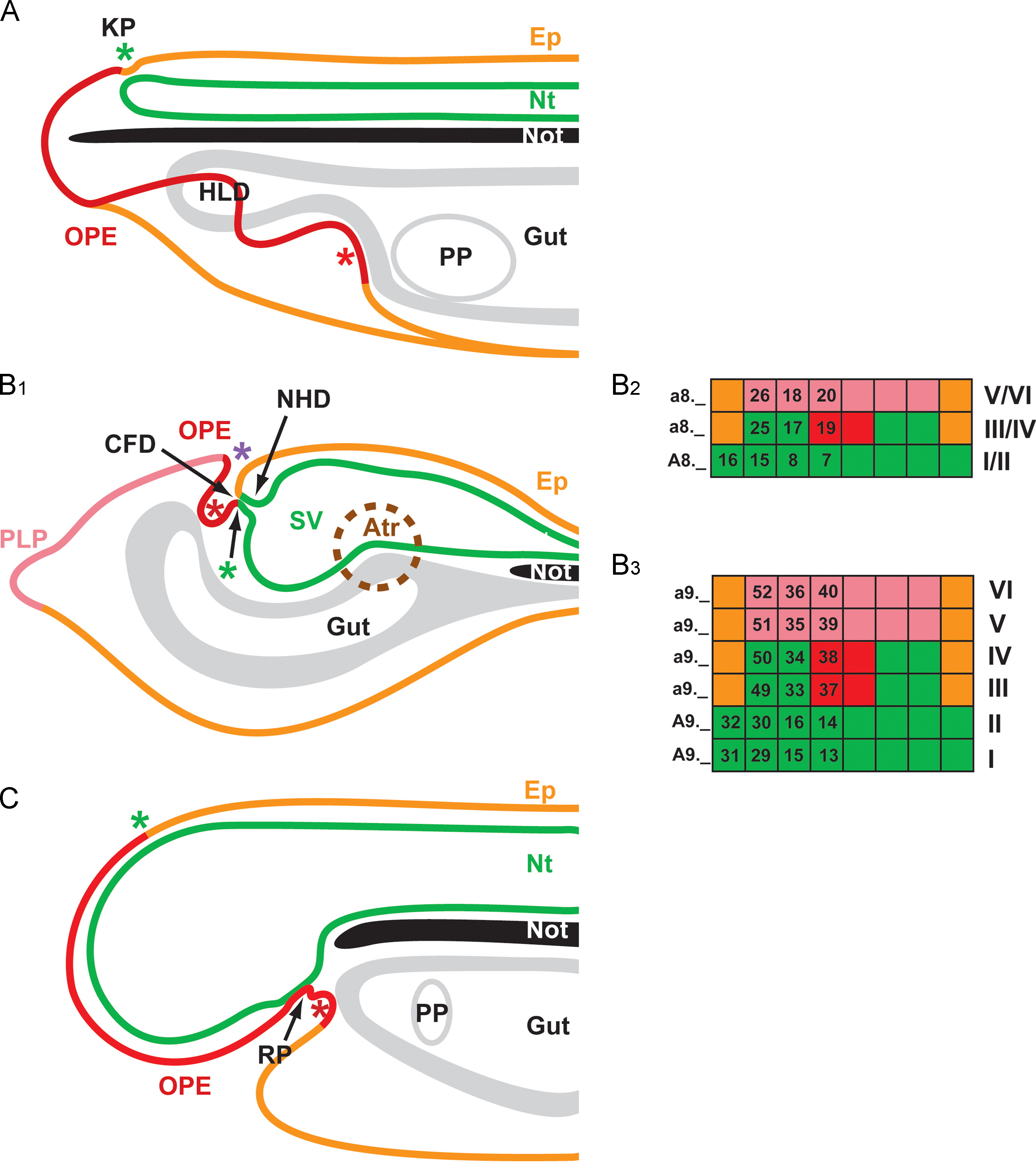 Fig. 4. Anatomy of head region in chordate embryos after completion of neurulation. The neural tube is highlighted in green and the location of the anterior neuropore â a transitory connection between neural tube and non-neural ectoderm â is indicated by a green asterisk. The non-neural ectoderm is highlighted in orange (general epidermis), red (oral and preoral part of the epidermis, extending from mouth to anterior neuropore) and pink (palp forming region of epidermis in tunicates). The position of the developing mouth is indicated by a red asterisk. (A) Amphioxus. Hatschek׳s left diverticulum (HLD), which forms as an endodermal pouch on the left side, will fuse with the preoral ectoderm to give rise to Hatschek׳s pit. (B) Tunicates (Ciona). In tunicates, the oral and preoral parts of the non-neural ectoderm, which form the primordium of the oral siphon (also known as buccal cavity or stomodeum) participate in neurulation. The resulting externally visible pore of the neurulating ectoderm or âneuroporeâ (purple asterisk) is, thus, distinct from the proper neuropore at the terminal end of the neural tube (green asterisk). This connection between anterior neural tube (sensory vesicle) and oral siphon primordium persists in some larval tunicates with a neurally derived neurohypophysial duct (NHP) and a ciliated funnel and duct (CFD) derived from the oral siphon primordium. These structures will later form the neural gland of the adult. Most of the larval CNS will degenerate at metamorphosis except for a few progenitor cells that will give rise to the new cerebral ganglion of the adult. The primordia of the atrial siphons (Atr; hatched brown line) will only develop at late larval stages by invagination. (B2 and B3) Fatemaps of the so-called âneural plateâ of ascidians at 110-cell stage (B2) and mid-gastrula stage (B3) showing the regions of origin of the neural tube (green), oral and preoral ectoderm (red), palps (pink) and general epidermis (orange) ( Nishida, 1987). (C) Vertebrates. Elaboration of the forebrain results in expansion of the preoral ectoderm, which includes precursors for epidermis and anterior (adenohypophyseal, olfactory, and lens) placodes. The adenohypophyseal placode buds off the stomodeum as Rathke׳s pouch (RP) to form the anteriorpituitary (A, B1, and C modified from Schlosser, 2005). Abbreviations: Atr, atrial siphon primordium; CFD, ciliary funnel and duct; Ep, epidermis; HLD, Hatschek׳s left diverticulum; KP, Kölliker׳s pit; NHD, neurohypophysial duct; Not, notochord; Nt, neural tube; OPE, oral-preoral ectoderm; PLP, palps; PP, pharyngeal pouches; RP, Rathke׳s pouch; SV, sensory vesicle
