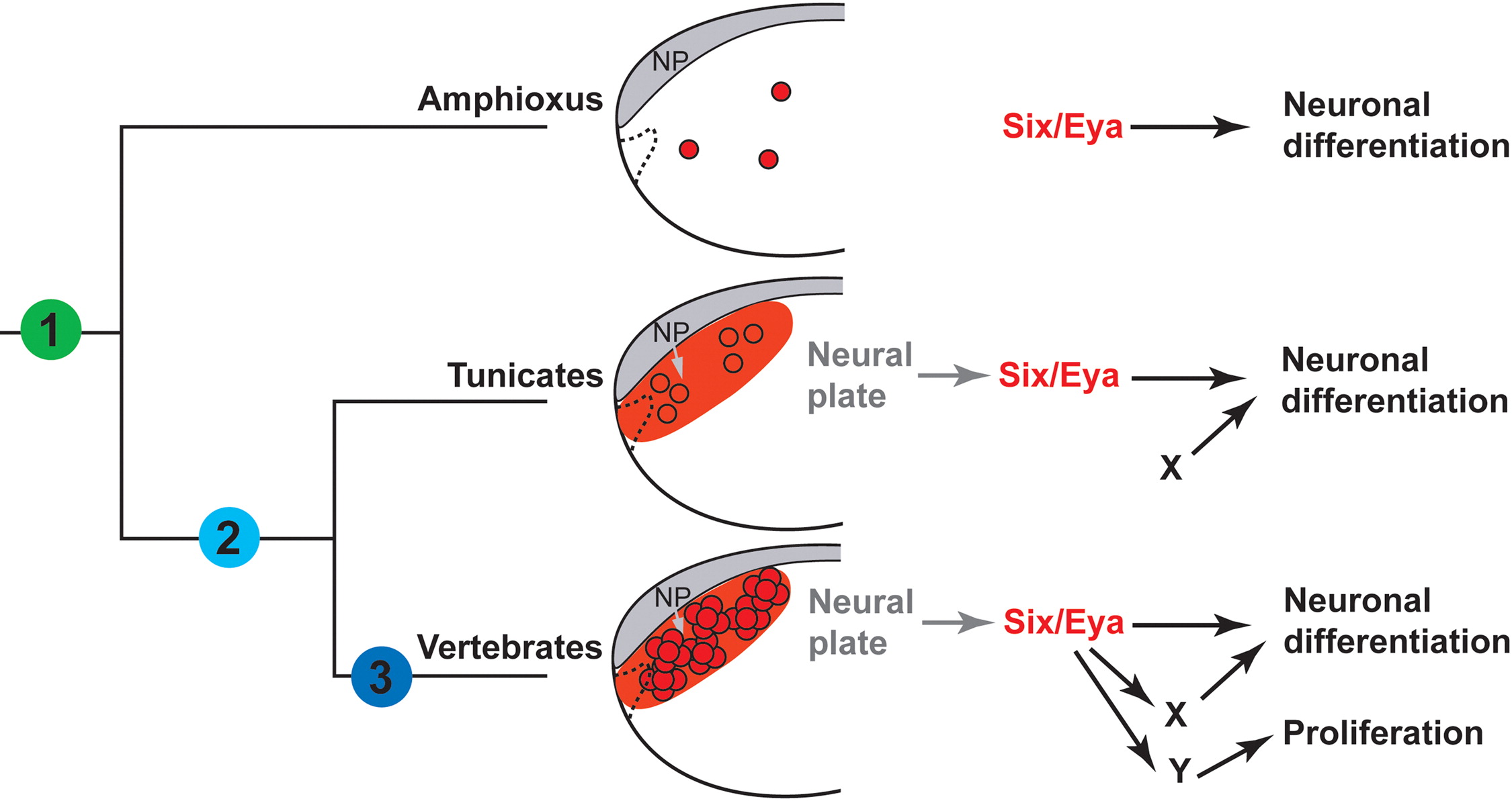Fig. 5. Scenario for regulatory evolution upstream and downstream of Six1/2 and Eya genes in chordates. It is proposed that the role of Six1/2 and Eya in vertebrate placodes evolved in 3 steps. Step 1: In the chordate ancestor, Six1/2 and Eya were expressed in sensory cells scattered throughout the non-neural ectoderm regulating their neuronal/sensory differentiation. This condition is maintained in amphioxus. Step 2: In the common ancestor of tunicates and vertebrates Six1/2 and Eya acquired new upstream regulators and were recruited to the border of the non-neural ectoderm with the neural plate. However, only scattered sensory cells differentiate from that region, indicating that Six1/2 and Eya probably cooperate with other factors (X) to promote neuronal/sensory differentiation. This condition is maintained in tunicates. Step3: In the vertebrate lineage, Six1/2 and Eya acquired new target genes (X and Y) allowing them to adopt additional roles in patterning and proliferation control of neuronal/sensory progenitors. Neurula stage embryos are shown with the neural plate (NP) indicated in grey. Cells (circles) and regions expressing Six1/2 and Eya are highlighted in red. The position, where the mouth will form is indicated by a hatched line (modified from Schlosser, 2011).