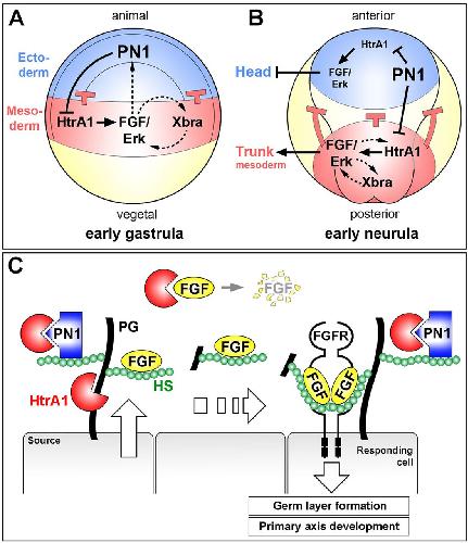 Fig. 8. Model for the spatial restriction of FGF signaling by PN1 in germ layer and primary axis development. (A,B) Feedback regulation of FGF/Erk signaling by the transcription factor Xbra and the secreted proteins HtrA1 and PN1 in early gastrula (lateral view, A) and early neurula (dorsal view, B) Xenopus embryo. Unbroken lines indicate biochemical interaction and dashed lines transcriptional regulation. Red bars represent inhibition of ectoderm and head development by mesodermal FGF signals. (C) Summary of the observations reported here and by Hou et al. (2007) of how the HtrA1 protease cleaves cell surface proteoglycans to mobilize FGF/proteoglycan messages that activate FGF receptors at a distance. As described by Kim et al. (2012), HtrA1 can also degrade non-bound FGF proteins. PN1, which binds to heparan sulfate (HS) (Li and Huntington, 2012), regulates paracrine FGF signaling by binding to and inhibiting HtrA1. |
