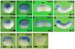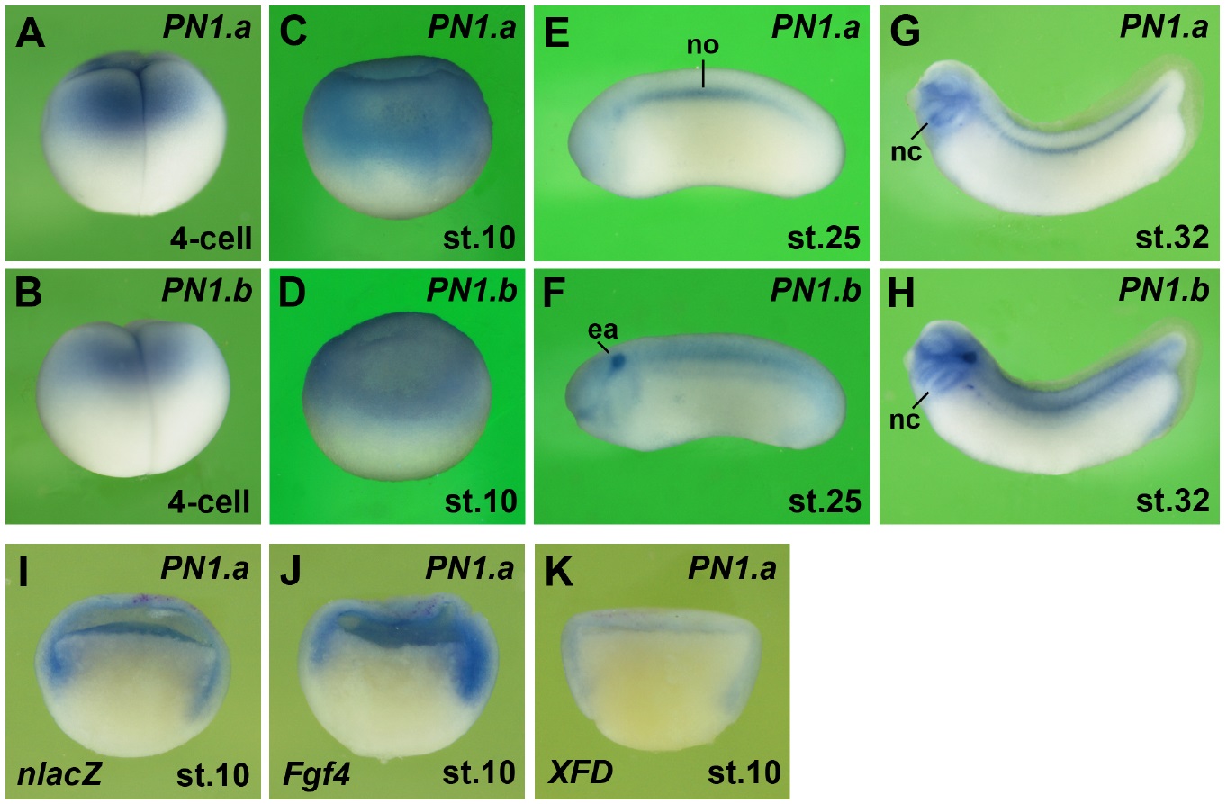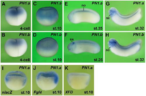 Figure S2. Gene expression and regulation of PN1.a and PN1.b (A-H) Lateral view of uninjected Xenopus embryos after whole-mount in situ hybridization for PN1.a (upper row) and PN1.b (lower row). (I-K) Hemi-sectioned gastrulae after a single injection of 9 pg Fgf4 mRNA (J) and 450 pg XFD mRNA (K). 100 pg nlacZ mRNA was co-injected as lineage tracer (red nuclei). ea, ear; nc, neural crest; no, notochord. |