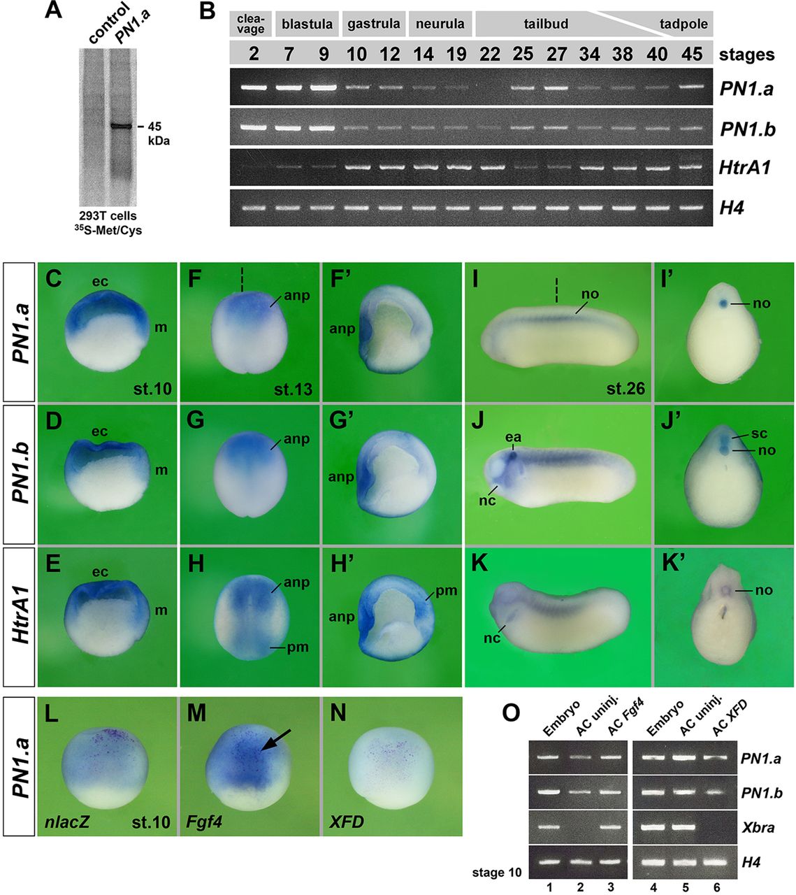 Fig. 1. Isolation and expression of Xenopus PN1. (A) SDS-PAGE of supernatant from transfected and [35S]methionine/cysteine-labeled HEK293T cells. The 45â kDa band corresponds to secreted PN1.a protein. (B) RT-PCR of PN1.a, PN1.b and HtrA1 in Xenopus embryos. Histone H4 was used for normalization. (C-Kâ²) Whole-mount in situ hybridization of PN1.a, PN1.b and HtrA1 at stage 10 (C-E, hemisections), stage 13 (F-H, dorsal views; Fâ²-Hâ², hemisections) and stage 26 (I-K, lateral views; Iâ²-Kâ², transverse sections). Dashed lines indicate section planes. anp, anterior neural plate; ea, ear; ec, ectoderm; m, mesoderm; nc, neural crest; no, notochord; pm, posterior mesoderm; sc, spinal cord. (L-N) Lateral view of stage 10 embryos. A single injection of 9â pg Fgf4 mRNA stimulates (arrow) and 450â pg XFD mRNA downregulates PN1.a expression. nlacZ mRNA was co-injected as lineage tracer (red nuclei). The frequency of embryos with the indicated phenotypes was: L, 67/67; M, 57/63; N, 47/53. (O) RT-PCR of PN1.a and PN1.b in animal cap (AC) explants injected with 12â pg Fgf4 and 4.5â ng XFD mRNA (n=3 replicates). |