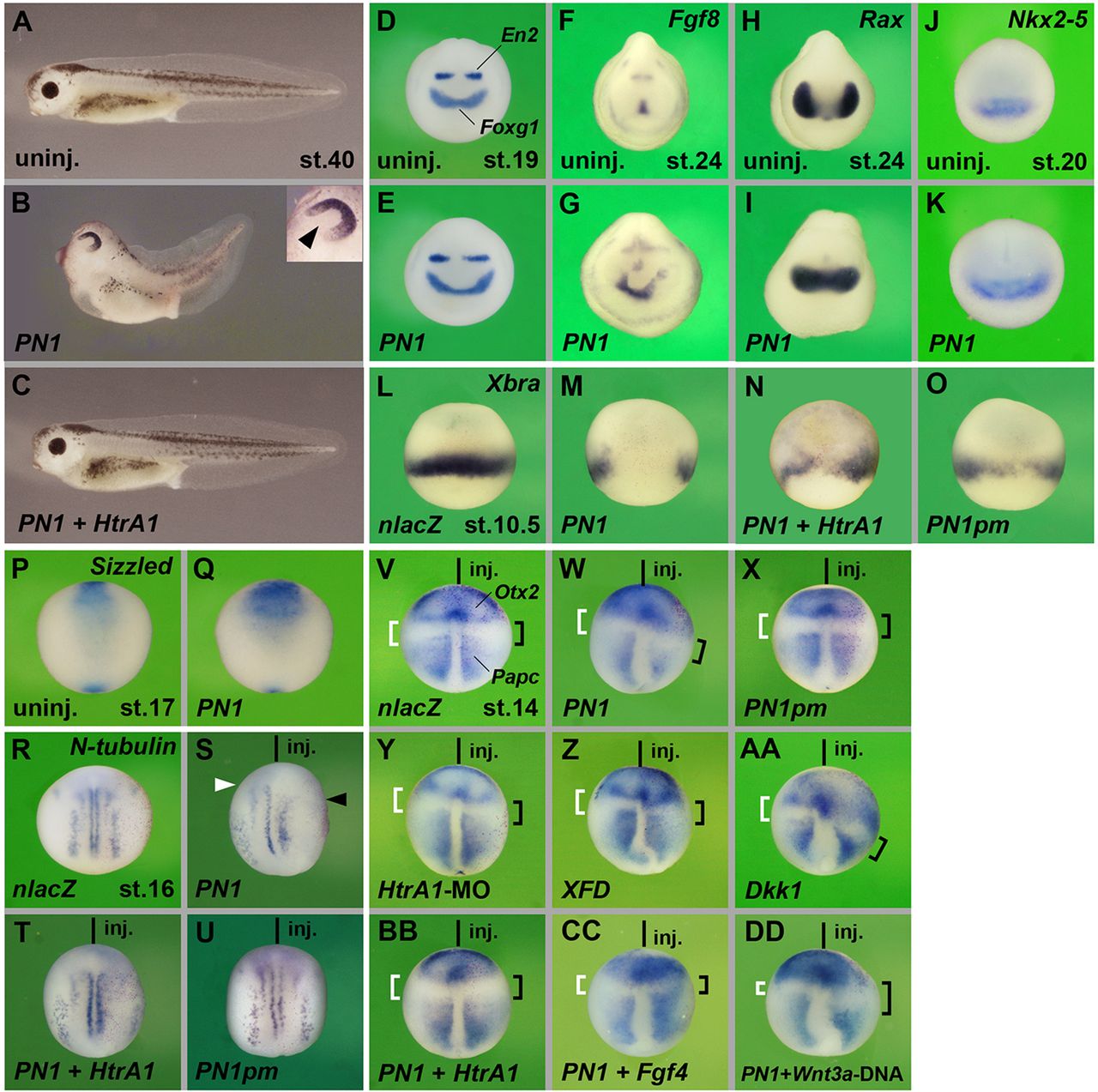 Fig. 2. PN1 promotes anterior development, suppresses mesoderm and reduces neuronal differentiation. (A) Uninjected tadpole embryo. (B) Injection of PN1 mRNA induces enlargement of head structures and coloboma (arrowhead in inset). (C) Co-injection of PN1 and HtrA1 mRNA restores normal development. (D-K) Whole-mount in situ hybridization of post-neurula embryos in anterior view. PN1 causes enlargement of the Foxg1, En2, Fgf8 and Nkx2-5 expression domains. Rax expression is not split into bilateral domains. (L-O) Xbra expression in early gastrulae, lateral view. A single marginal injection of PN1 strongly reduces Xbra expression (M). PN1 and HtrA1 partially revert this effect (N). PN1pm mRNA causes only mild or no reduction of Xbra expression (O). (P,Q) Ventral view of neurulae. PN1 expands anterior Sizzled expression. (R-X,BB) Dorsal view of neurula embryos. A single injection of PN1 causes reduction and posteriorward retraction of N-tubulin (arrowheads in S), reduction of Papc and expansion of Otx2 expression (brackets in W) on the targeted right side. PN1 and HtrA1 rescue these effects (T,BB). PN1pm does not affect these markers (U,X). (Y-AA) Injection of 15â ng HtrA1-MO, XFD mRNA or Dkk1 mRNA also causes anteriorization. (CC) Fgf4 mRNA rescues anteriorization by PN1. (DD) pCS2-Wnt3a (Wnt3a-DNA) reverts PN1-induced Otx2 expansion, but not Papc reduction. Total mRNA amounts were: PN1 constructs, 4â ng (1â ng in W,X,BB-DD, 16â ng in E,K,Q); HtrA1, 100â pg; XFD, 80â pg; Dkk1, 8â pg; Fgf4, 0.3â pg. Indicated phenotypes were shown by: B, 44/56; C, 30/30; E, 19/21; G, 16/16; I, 13/15; K, 14/17; M, 71/73; N, 18/32; O, 23/32; Q, 9/19; S, 41/42; T, 16/19; U, 42/42; W, 57/62; X, 31/39; Y, 20/24; Z, 27/31; AA, 59/60; BB, 19/23; CC, 19/24; DD, 15/16. |