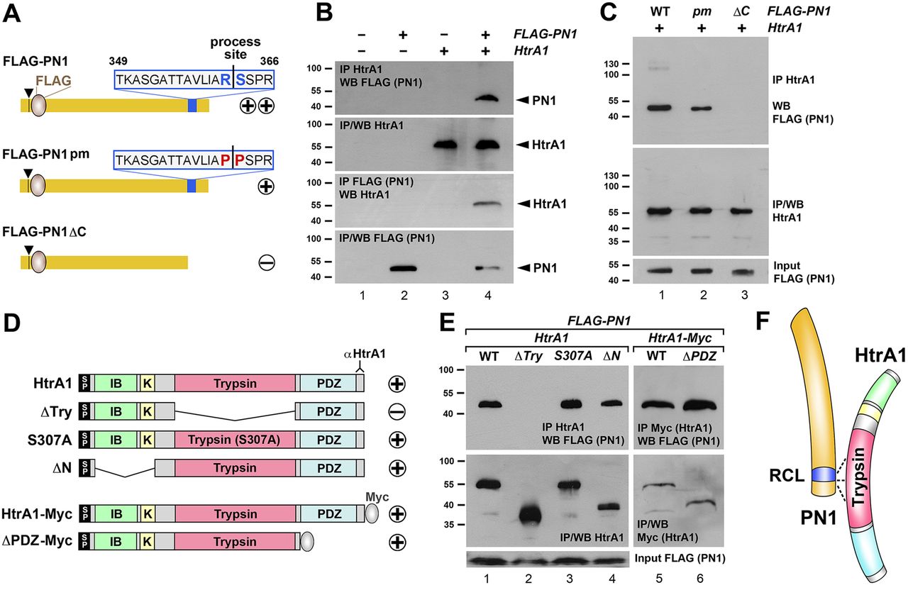 Fig. 3. PN1 binds to HtrA1. (A) Overview of FLAG-tagged protein constructs of wild-type PN1, point mutant PN1pm and C-terminal deletion mutant PN1δC. Arrowhead indicates the signal peptide cleavage site and numbers indicate the amino acid position of the reactive center loop (RCL). Plus/minus signs indicate binding to HtrA1 protein. (B) HtrA1 co-immunoprecipitates with FLAG-PN1, and FLAG-PN1 in turn co-immunoprecipitates with HtrA1 in mRNA-injected embryos at stage 17. (C) Overexpressed HtrA1 immunoprecipitates FLAG-PN1pm less efficiently than FLAG-PN1 and fails to immunoprecipitate FLAG-PN1δC in embryos at stage 10.5. (D) Overview of wild-type and mutant HtrA1 protein constructs. Plus/minus signs indicate binding to PN1 protein. SP, signal peptide; IB, IGF-binding domain; K, kazal-type serine protease inhibitor domain; Trypsin, trypsin-like serine protease domain; PDZ, PSD95/DLG1/ZO1 domain. The region recognized by HtrA1 antibody is indicated. (E) All indicated HtrA1 constructs, except HtrA1δTry, immunoprecipitate FLAG-PN1 at similar levels in embryos at stage 11. (F) Model of PN1-HtrA1 interaction. The trypsin domain of HtrA1 binds to the RCL-containing C-terminus of PN1. (B,C,E) mRNA amounts were: HtrA1-derived, 100â pg; PN1-derived, 300â pg. |