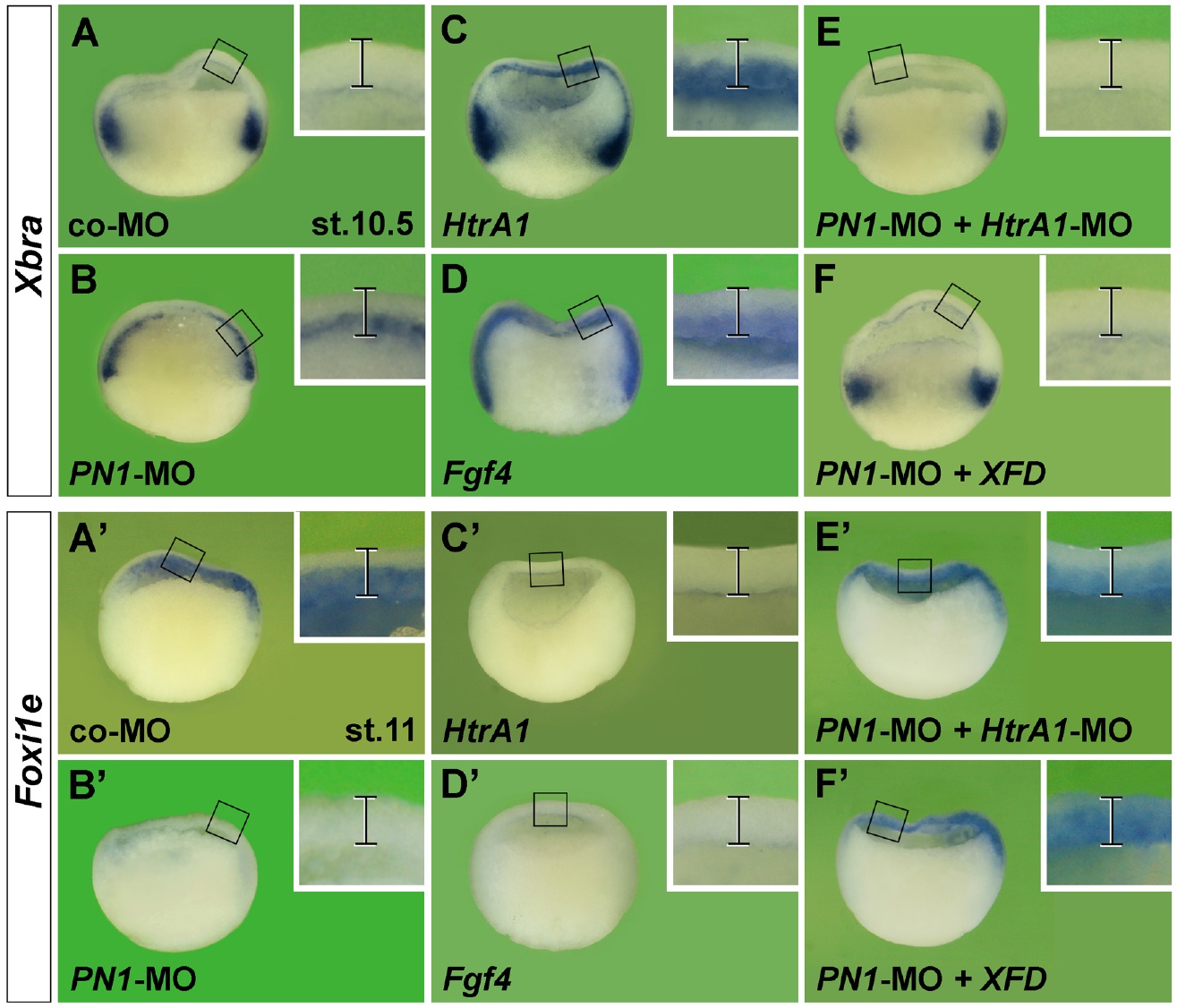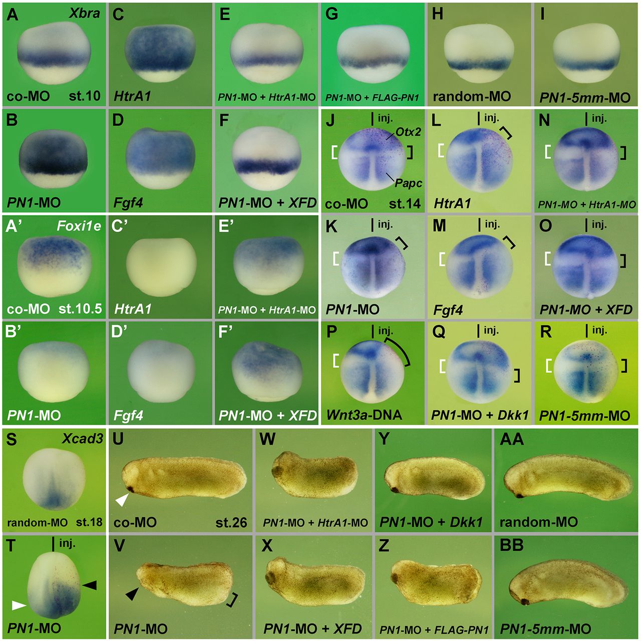 Fig. 5. PN1 functions in an HtrA1-, FGF- and Wnt-dependent manner. (A-Dâ²) Lateral view of early gastrula embryos. PN1-MO, HtrA1 mRNA and Fgf4 mRNA, but not co-MO, induce ectopic Xbra expression (A-D) and a reduction of Foxi1e expression (Aâ²-Dâ²) in the animal hemisphere. (E-Fâ²) In PN1 morphant embryos, 20â ng HtrA1-MO and XFD mRNA restore normal expression of Xbra and Foxi1e. (G-I) Random-MO, PN1-5mm-MO, and a combination of PN1-MO and non-targeted FLAG-PN1 mRNA do not affect Xbra expression. (J-T) Dorsal view of neurulae. A single injection of PN1-MO shifts the border between Otx2 and Papc (brackets in K) and expands Xcad3 expression (arrowheads in T) anteriorward. Co-MO and PN1-5mm-MO have no effect on Otx2 and Papc (J,R), and random-MO has no effect on Xcad3 expression (S). HtrA1 mRNA, Fgf4 mRNA and Wnt3a-DNA reduce Otx2, but only HtrA1 and Fgf4 expand Papc expression (L,M,P). Co-injections of 5â ng HtrA1-MO, XFD and Dkk1 mRNA revert the effect of PN1-MO and cause slight expansion of Otx2 and posteriorward retraction of Papc signals (N,O,Q). (U-BB) PN1-MO reduces head structures (arrowhead) and expands the proctodeum (bracket in V), whereas co-MO, random-MO and PN1-5mm-MO have no effect in tailbud embryos (U,AA,BB). 20â ng HtrA1-MO, XFD, Dkk1 and FLAG-PN1 rescue posteriorization in PN1 morphants (W-Z). Injected mRNA amounts per embryo were: HtrA1, 200â pg (50â pg in L); Fgf4, 2â pg (0.5â pg in M); XFD, 80â pg (20â pg in O); FLAG-PN1, 800â pg; Dkk1, 24â pg (8â pg in Q). Indicated phenotypes were shown by: A, 136/144; Aâ², 50/59; B, 154/186; Bâ², 50/69; C, 21/21; Câ², 47/57; D, 79/79; Dâ², 93/97; E, 66/90; Eâ², 52/56; F, 72/83; Fâ², 45/51; G, 24/30; H, 44/46; I, 14/24; J, 12/13; K, 14/14; L, 60/60; M, 45/49; N, 17/17; O, 9/9; P, 34/36; Q, 55/55; R, 31/32; S, 8/8; T, 28/30; U, 75/77; V, 97/95; W, 48/59; X, 23/24; Y, 67/65; Z, 22/23; AA, 7/10; BB, 10/15. |