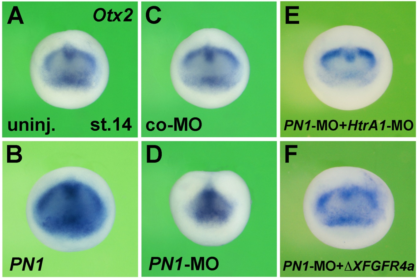 Figure S7. PN1 promotes anterior development via inhibition of HtrA1-, FGF- and Wnt signals Embryos were animally injected with MOs at the 2-cell stage and mRNAs at the 4-cell stage. (A) Anterior view of early neurula embryos after whole-mount in situ hybridization with Otx2, demarcating the prospective cement gland, forebrain and midbrain. (B) PN1 mRNA (4 ng) causes expansion of Otx2 expression. (C,D) PN1-MO (60 ng) reduces the Otx2 marker, while an equivalent amount of control-MO has no effect. (E,F) HtrA1-MO (20 ng) or 80 pg δXFGFR-4a mRNA restore normal Otx2 expression in PN1 morphant embryos. Indicated phenotypes were observed in B, 12/13; C, 59/62; D, 63/73; E, 22/24; F, 23/29. |