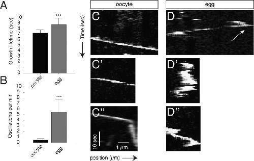Fig. 2. Plus ends exhibit oscillatory behavior in the cortex of the unactivated egg. (A) Mean plus end growth lifetime. (B) number of plus end oscillations in oocytes and eggs. Error bars represent standard deviations around the mean; âââ=p-value<1.0E-9 (t-test). N=40 in (A), N=10 in (BâDâ²). (CâCâ², DâDâ²) Representative kymographs of EB3-GFP comets in oocytes and eggs. The arrow in (C) indicates an example of the initiation of rearward oscillation. |