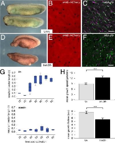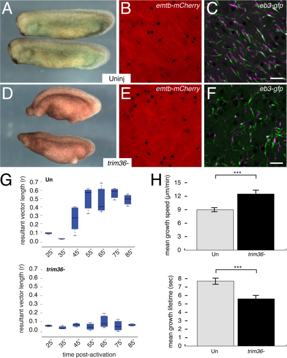Fig. 7. Disordered microtubule assembly and plus end orientation in trim36-depleted embryos. (A, D) Representative control uninjected (Uninj) and trim36-depleted (trim36-) tailbud stage embryos (stage 28) obtained from host-transfer experiments. Anterior to left, dorsal to top. (B, E) Individual frames from time-lapse movies of eb3-gfp+emtb-mCherry-expressing eggs, showing EMTB-labeled microtubules ~45 min post-activation. (C, F) Averaged, merged and pseudo colored frames of EB3-labeled microtubule plus ends. Frames 1â5 are shown in green; frames 7â11 are in magenta. ( Video S7 and Video S8). (G) Average r values for MT plus ends in uninjected control (upper panel) and trim36-depleted (lower panel) eggs. The dark bar in each box indicates the median r value per group, lower and upper edges of the colored boxes indicate 25th and 75th percentiles respectively, whiskers represent maximum and minimum adjacent values. (H) Graphs showing mean plus end growth speed (upper panel) and lifetime (lower panel) in control and trim36-depleted eggs (~45 min post-fertilization). Error bars indicate standard deviation; âââ=p<1.0E-4 (t-test). N=9 prick-activated eggs per group (donor oocytes from three different females). Scale bar=5 µm (applies to B, C, E, F). |