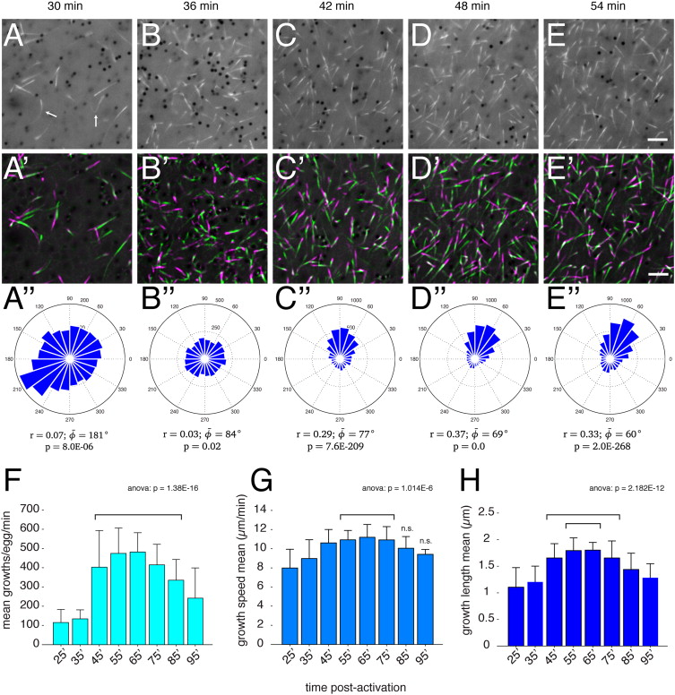 Fig. 4. Changes in microtubule plus end dynamics during cortical rotation in activated eggs. (AâE) Individual frames from time-lapse movies of a representative EB3-GFP-expressing prick-activated egg and the indicated times; (A׳-E׳) Frames 1â5 and 7â11 of each movie were averaged, merged and pseudo colored green and magenta respectively, representing 20 s of MT plus end growth. Arrows in (A) indicate curved and kinked plus end comets. (Aâ² and Eâ²) Angle histogram plots showing the directionality of individual MT plus end tracks. Plots show number of tracks per bin for each two-minute time-lapse movie. Circular statistics for each dataset are shown below the plot, indicating mean resultant vector length (r, where 0â¤râ¤1; 1= concentration at mean angle), mean angle (ÏÌ , phi_bar) and p-value of the Rayleigh test for circular uniformity. Please note differing scales on the plots. (F-H) Graphs showing mean plus end growth numbers (F), speed (G) and length (H) at the indicated time points; N=21 prick-activated eggs (seven experiments, three eggs per experiment). The p-values from one-way ANOVA are indicated at the top; brackets indicate groups not statistically different from each other but differing from all surrounding groups (excluding n.s.) in post-hoc multiple comparison tests (using Tukey׳s HSD criterion; n.s.=not significantly different from any group). Scale bar=5 µm. |