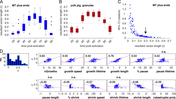 Fig. 5. Microtubule plus end orientation occurs subsequent to the onset of cortical rotation. (A-B) Average r values for MT plus ends (A) and the yolk mass (B); N=21 prick-activated eggs. The dark bar in each box indicates the median r value per group, lower and upper edges of the colored boxes indicate 25th and 75th percentiles respectively, whiskers represent maximum and minimum adjacent values (excluding outliers (+)). The dashed line demarcates the estimated r value at which directionality becomes strongly concentrated (0.3, determined in panel (C)). (C) Scatterplot of mean resultant vector length against the 95% confidence interval (CI). The arrow indicates the value of r where the CI reaches a consistent minimum. (D) Correlation plots of r value against other dynamic parameters. The first panel shows the histogram of mean resultant vector length data, the remaining panels show scatterplots of other variables paired with r. The pink lines indicate the least-squares reference lines; correlation coefficients are shown in each graph panel. n.s. indicates which panels have non-significant p-values for the correlation. |