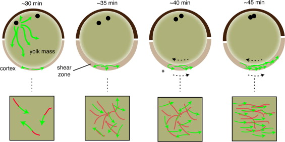 Fig. 8. Model for dorsal microtubule orientation during the initiation of cortical rotation. Microtubules are depolymerized immediately after fertilization (not shown) and begin to polymerize in the cortex by 30 min post-fertilization (~30 min). Growing plus ends (green arrows) generate trailing stable microtubules (red). In a more animal position, astral microtubules have assembled around the sperm pronucleus and these may extend vegetally and stimulate or contribute to the growth in the cortex (omitted for clarity in other panels). By 35 min post-fertilization (~35 min), the numbers of growing plus ends begins to increase and a dense cortical microtubule network is formed. Around this time, the yolk increases in firmness and the viscosity in the subcortical cytoplasm decreases, creating a fluid shear zone that allows relative movement between the two regions of the egg. This is represented in the model as a thickening in the vegetal region although this likely happens throughout the egg. As this occurs, the microtubule network associates with the deeper yolk mass (subduction; represented by lighter shading) and moves with that structure during cortical rotation. There is no obvious bias in plus end orientation at this time. At 40 min post-fertilization (~40 min), cortical rotation is apparent (dotted arrow indicates relative movement) and plus ends become directionally oriented at this time. We suggest that new growth is oriented because plus ends remain primarily cortical whereas the stabilized body of the microtubule is dragged in the opposite direction by its association with the yolk mass (asterisk). Shear induced shortening of misaligned microtubules may also occur at this time. As plus end growths increase in number, new trailing microtubules would then associate with the moving yolk mass or become aligned by shear and pull the plus ends into alignment (~45 min). The upper images depict sagittal sections of eggs, with the animal pole toward the top and presumptive dorsal to the right. The lower panels represent en face views of the vegetal cortex. |
