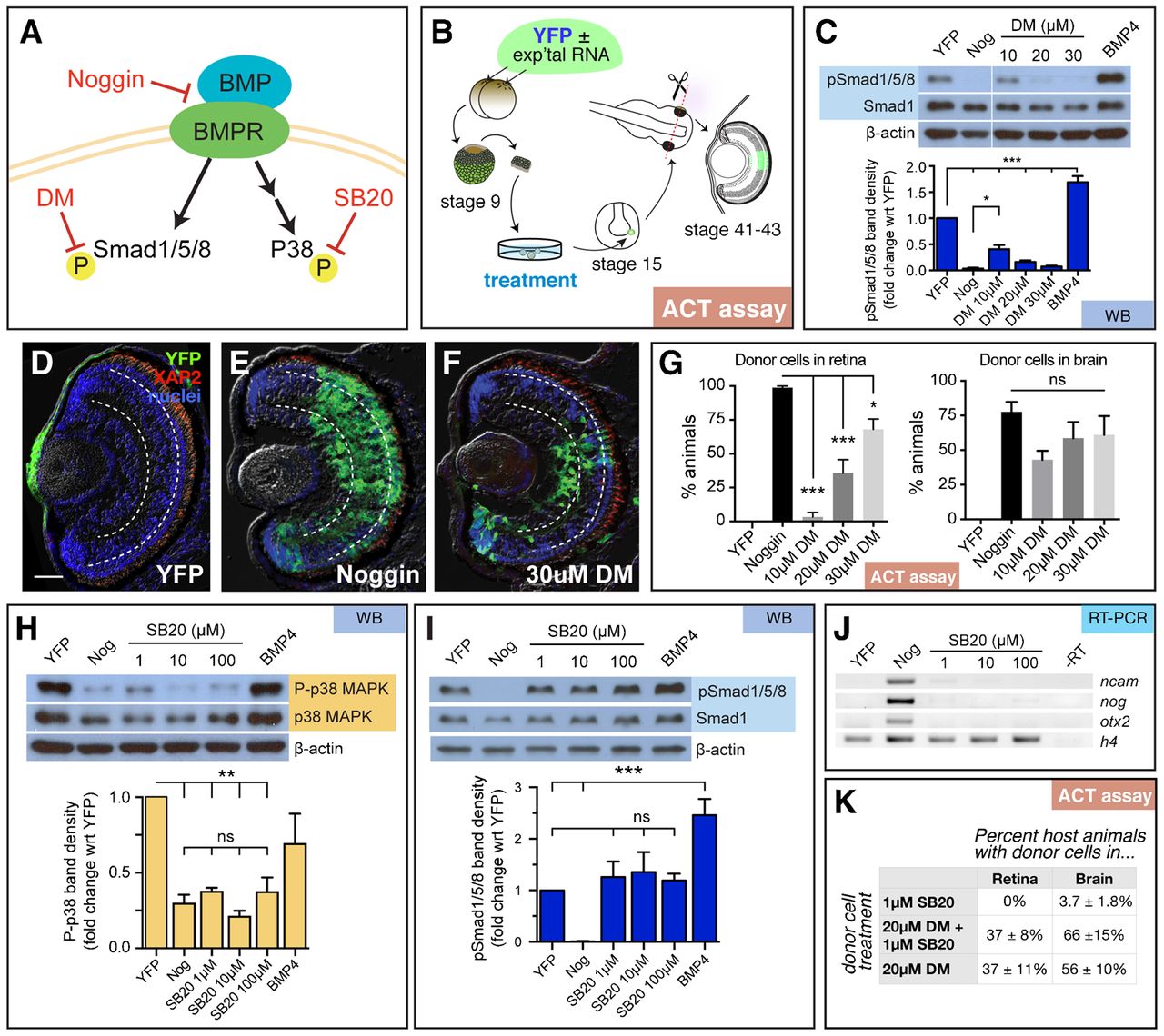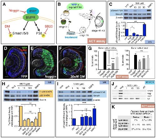 (A) Schematic of the canonical and non-canonical BMP pathways and the downstream signaling molecules, Smad1/5/8 and p38 MAPK, respectively. Small molecule inhibitors dorsomorphin (DM) and SB203580 (SB20) were used to specifically inhibit canonical and non-canonical signaling, respectively. (B) Diagram of experimental design for animal cap transplant (ACT) assay. YFP RNA with and without experimental (exp'tal) RNA was injected into both cells of a two-cell stage embryo. The animal cap was removed from the blastula (stage 9) and cultured until sibling embryos formed a neural plate (stage 15). Part of the animal cap was then transplanted into the eye field of a host embryo, which was grown until the eye differentiated (stages 41 to 43). Cryostat sections were analyzed for the presence of YFP+ transplanted cells. (CâG) Analysis of canonical signaling pathway. (C) Western blots were used to detect pSmad1/5/8, Smad1, and β-actin in stage 15 animal caps treated with DM. Treatment with 20 and 30â