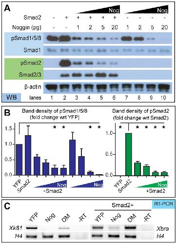 pg Smad2 RNA. Smad1, Smad2, and β-actin served as loading controls. (B) Densitometric analysis of western blots shows that higher concentrations of Noggin inhibit pSmad1/5/8 and pSmad2 (Nâ=â3). (C) Noggin inhibits BMP and Activin pathway-specific gene transcription. Noggin-treated caps can inhibit the epithelia marker, xk81, and mesoderm marker, xbra, as determined through RT-PCR. Conversely, DM affects BMP, not Activin, pathway gene transcripts since it can only affect xk81 expression; Nâ=â3. Error bars â=â ±s.e.m.; *p<0.05. |