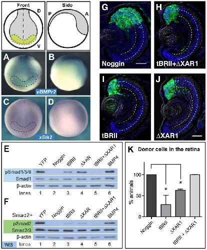 ng) receptors individually suppress pSmad1/5/8, but signaling is repressed further with expression of both tBRII+δXAR1. (F) pSmad2 is also repressed with the expression of both tBRII and δXAR1. (GâK) Using the ACT assay, the tBRII+δXAR1-expressing cells end up in the retina more frequently than either the tBR or δXAR1-expressing pluripotent cells. Scale bar, 50 µm. Dashed lines lie on outer and inner plexiform layers. (K) ACT results quantified and statistics determined using a student's t-test, Nâ=â2. Error bars â=â±s.e.m.; *p<0.05. Green, YFP; blue, DAPI staining. Dorsal âDâ, ventral âVâ, posterior âPâ, anterior âAâ. |