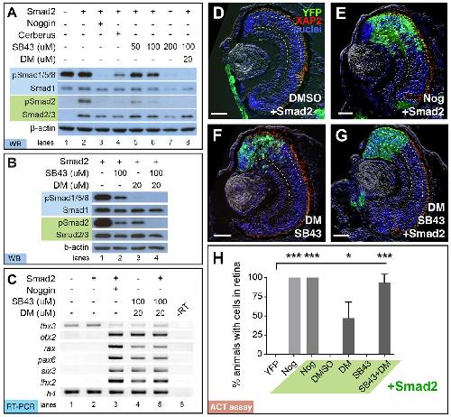 µM DM (SB43+DM) mimics Noggin's ability to suppress pSmad1/5/8 and pSmad2, as determined by western blot. (B) Suppression of both pSmad1/5/8 and pSmad2 is only complete with treatment of both SB43+DM. Smad1, Smad2, and β-actin served as loading controls. (C) RT-PCR analysis of animal caps shows that Noggin or SB43+DM±Smad2 induces expression of rax, pax6, six3, and otx2, while repressing tbx3. Histone H4 (h4) was used as a loading control. (DâH) DM+SB43±Smad2 treatment mimics the retinal integration efficiency of Noggin. (D) Smad2-injected cells treated with DMSO remain in the skin, while (E) Nog+Smad2 injected cells form retina in all animals. (F) SB43+DM treatment alone and (G) with Smad2 direct pluripotent cells to the retina. Scale bar, 50 µm. Dashed lines lie on outer and inner plexiform layers. (H) Quantification of ACT assay results shows the synergistic effect of adding DM and SB43 to generate retina (Nâ=â3). Green, YFP; red, rod photoreceptor marker, XAP2; blue, DAPI staining. Error bars â=â ±s.e.m.; **p<0.01; ***p<0.001 |