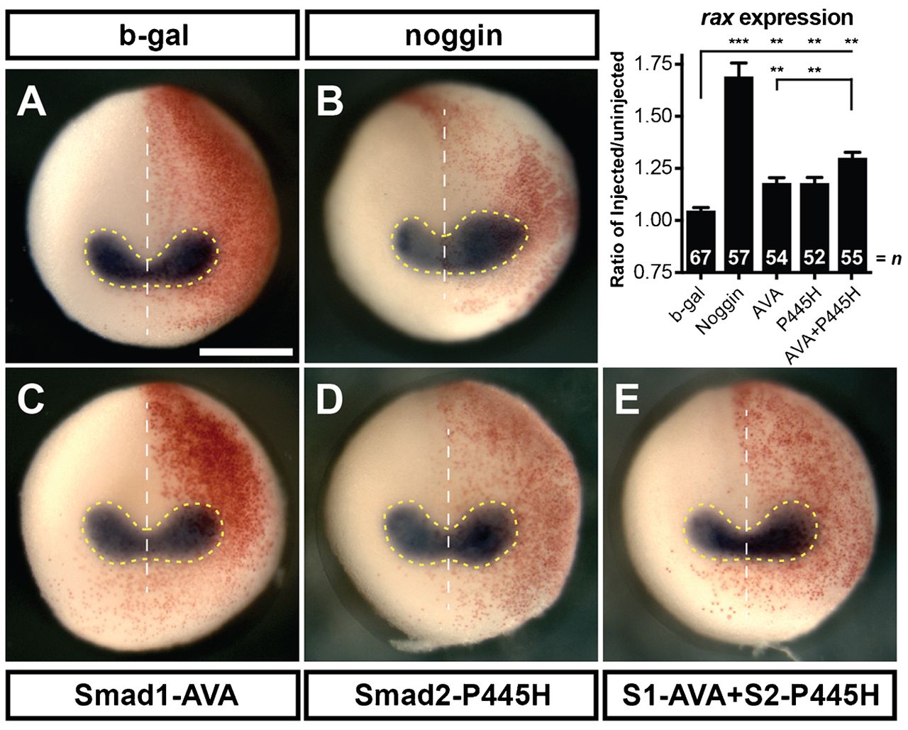 pg of β-gal. Area of rax expression was calculated by measuring the region within the dashed yellow lines on each side of the midline (white dotted line) as shown. Graph shows the ratio of the area of the injected side to the uninjected side. Red β-gal stain indicates injected side. Scale bar, 500â